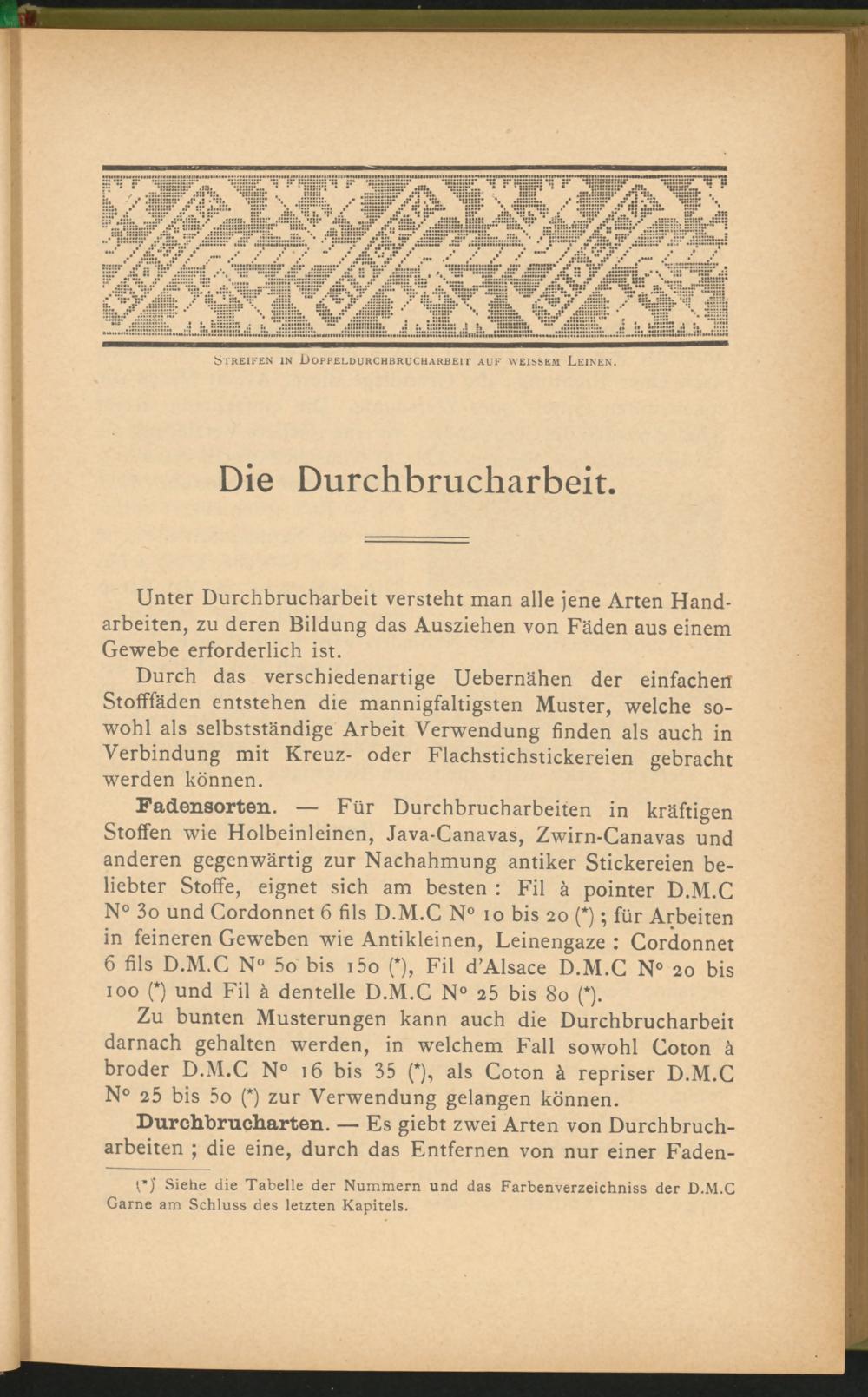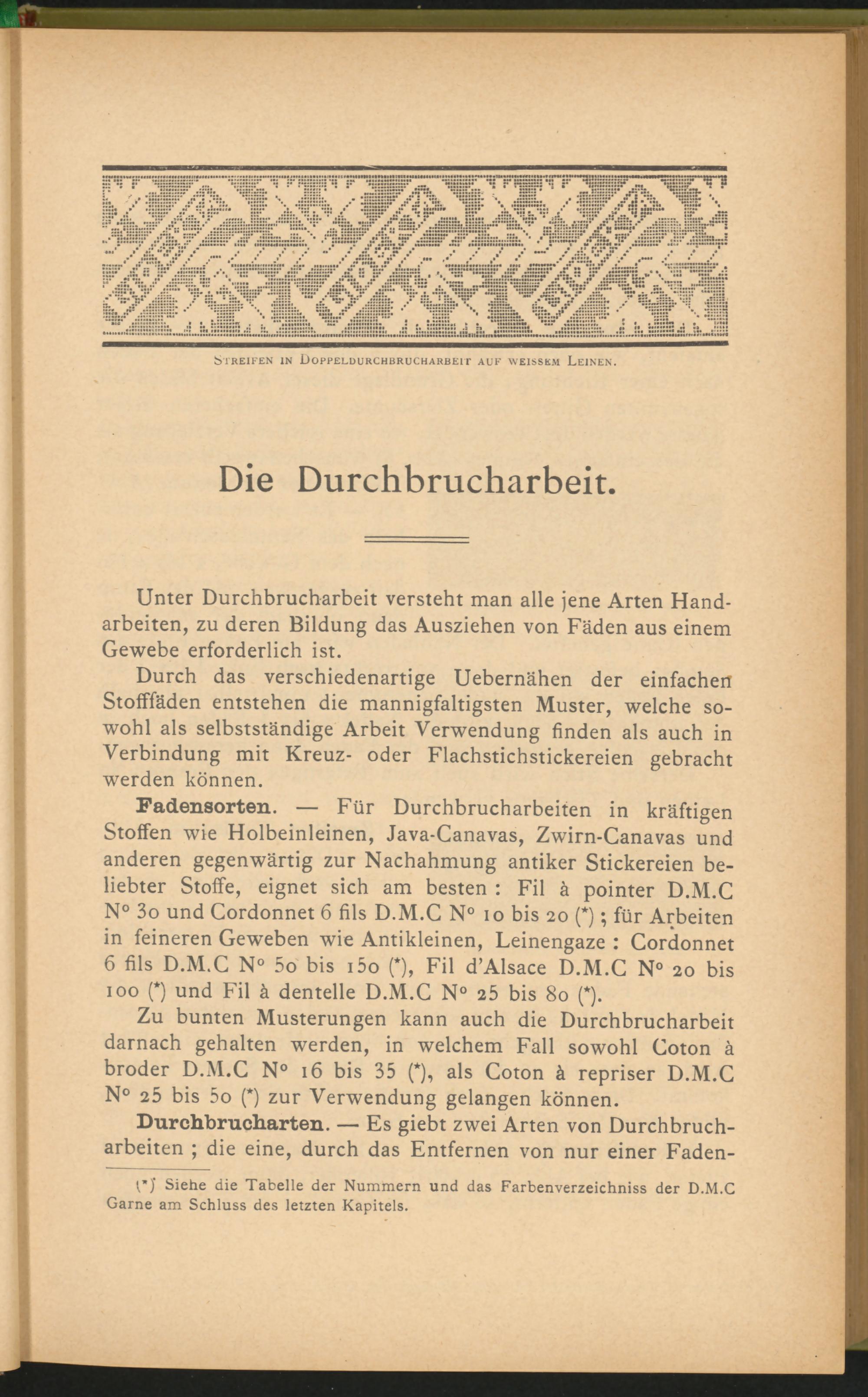 Zu bunten Musterungen kann auch die Durchbrucharbeit darnach gehalten werden, in welchem Fall sowohl Coton ä broder D.M.C N° 16 bis 35 (*), als Coton ä repriser D.M.C N° 25 bis 5 o (*) zur Verwendung gelangen können.