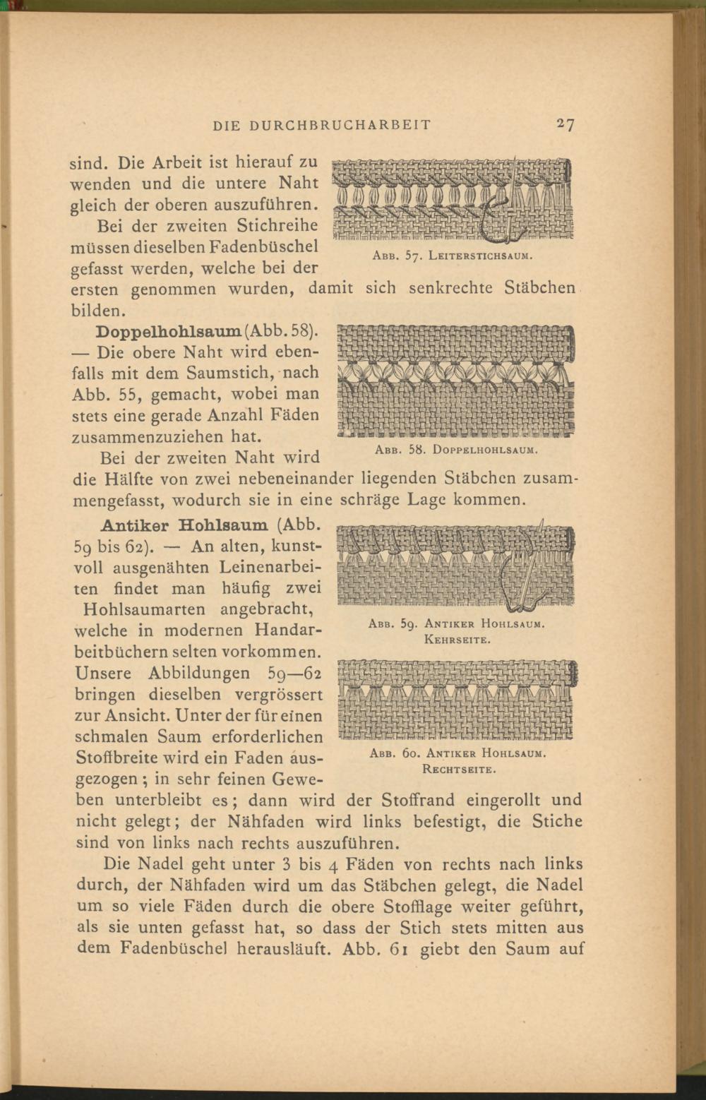 5g bis 62). — An alten, kunstvoll ausgenähten Leinenarbeiten findet man häufig zwei Hohlsaumarten angebracht, welche in modernen Handarbeitbüchern selten Vorkommen.
