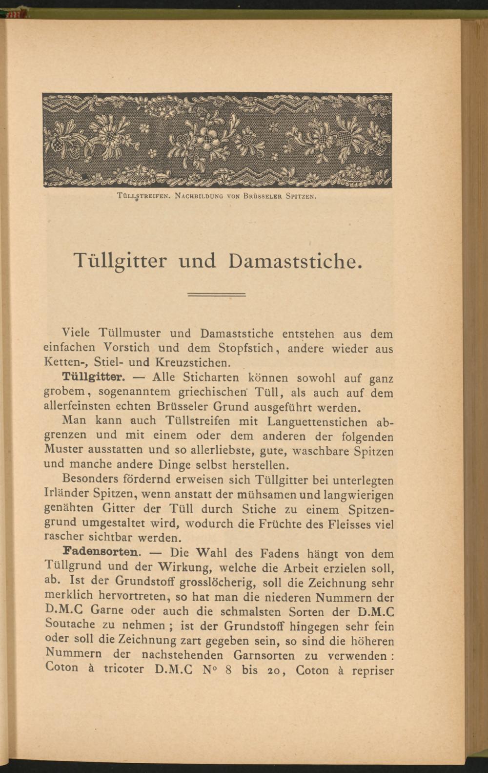 Fadensorten. — Die Wahl des Fadens hängt von dem Tüllgrund und der Wirkung, welche die Arbeit erzielen soll, ab. Ist der Grundstoff grosslöcherig, soll die Zeichnung sehr merklich hervortreten, so hat man die niederen Nummern der D.M.C Garne oder auch die schmälsten Sorten der D.M.C Soutache zu nehmen ; ist der Grundstoff hingegen sehr fein oder soll die Zeichnung zart gegeben sein, so sind die höheren Nummern der nachstehenden Garnsorten zu verwenden : Coton k tricoter D.M.C N° 8 bis 20, Coton ä repriser