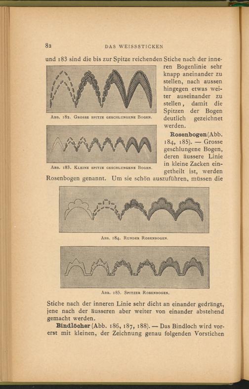 und 183 sind die bis zur Spitze reichenden Stiche nach der inneren Bogenlinie sehr knapp aneinander zu stellen, nach aussen hingegen etwas weiter auseinander zu stellen, damit die Spitzen der Bogen deutlich gezeichnet werden.