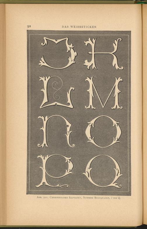 DAS WEISSSTICKEN äptläK »S’JcJifc «fe«- V$; • ,'f: Abb. 20i. Comblnirbares Alphabet. Äussere Buchötaben. J bis Q SKftH MB»