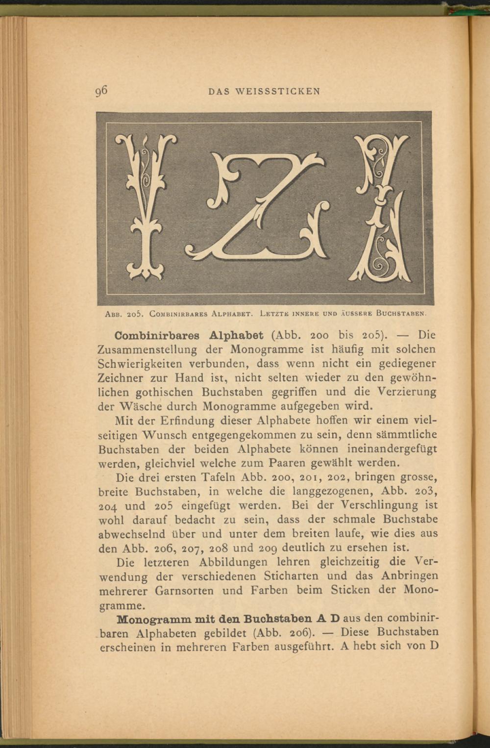 Combinirbares Alphabet (Abb. 200 bis 20b). — Die Zusammenstellung der Monogramme ist häufig mit solchen Schwierigkeiten verbunden, dass wenn nicht ein gediegener Zeichner zur Hand ist, nicht selten wieder zu den gewöhnlichen gothischen Buchstaben gegriffen und die Verzierung der Wäsche durch Monogramme aufgegeben wird.
