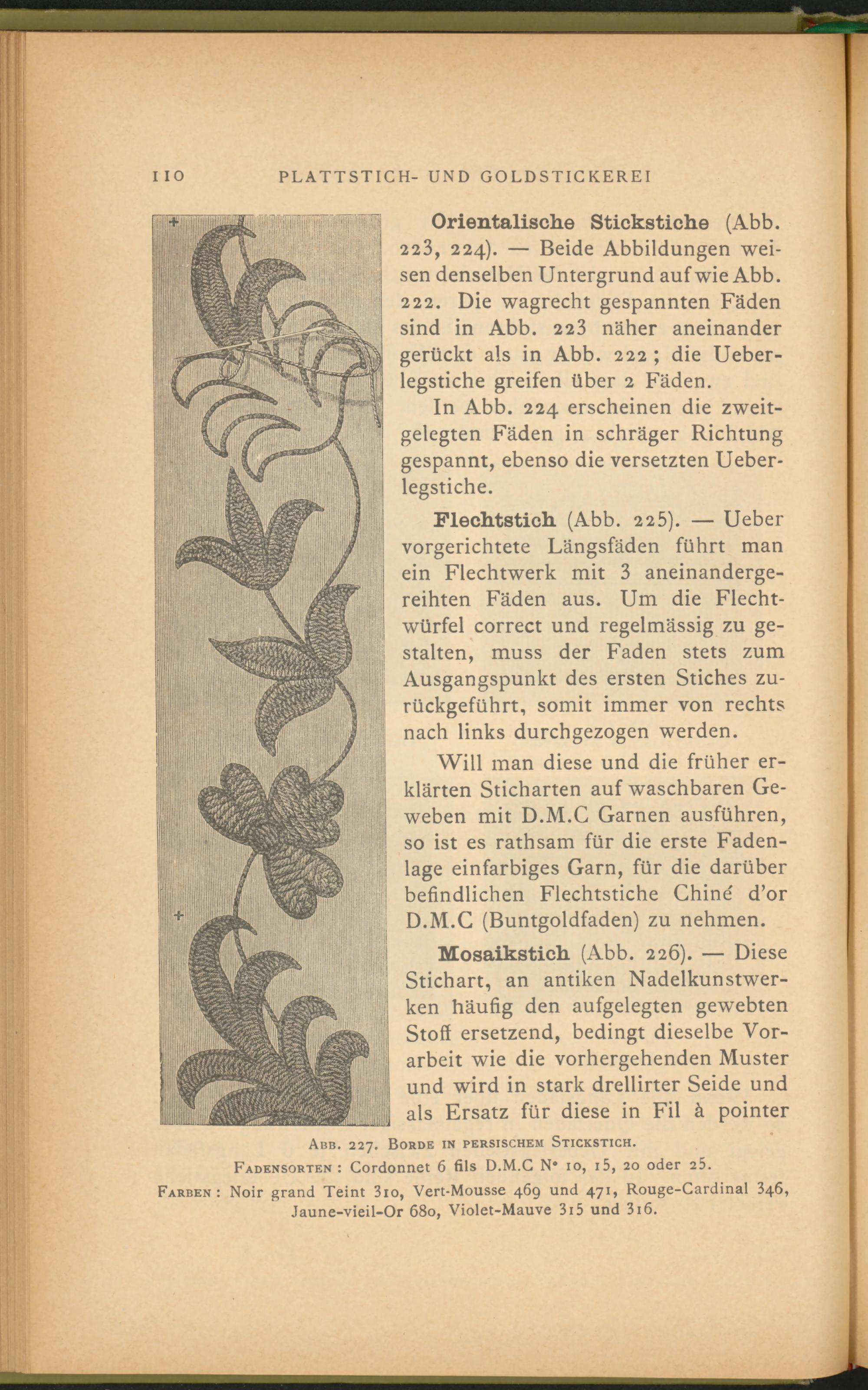 Will man diese und die früher erklärten Sticharten auf waschbaren Geweben mit D.M.C Garnen ausführen, so ist es rathsam für die erste Fadenlage einfarbiges Garn, für die darüber befindlichen Flechtstiche Chine' d’or D.M.C (Buntgoldfaden) zu nehmen.