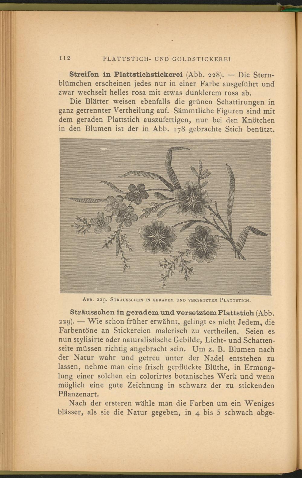 Sträusschen in geradem und versetztem Plattstich (Abb. 229). — Wie schon früher erwähnt, gelingt es nicht Jedem, die Farbentöne an Stickereien malerisch zu vertheilen. Seien es nun stylisirte oder naturalistische Gebilde, Licht- und Schattenseite müssen richtig angebracht sein. Um z. B. Blumen nach der Natur wahr und getreu unter der Nadel entstehen zu lassen, nehme man eine frisch gepflückte Blüthe, in Ermanglung einer solchen ein colorirtes botanisches Werk und wenn möglich eine gute Zeichnung in schwarz der zu stickenden Pflanzenart.