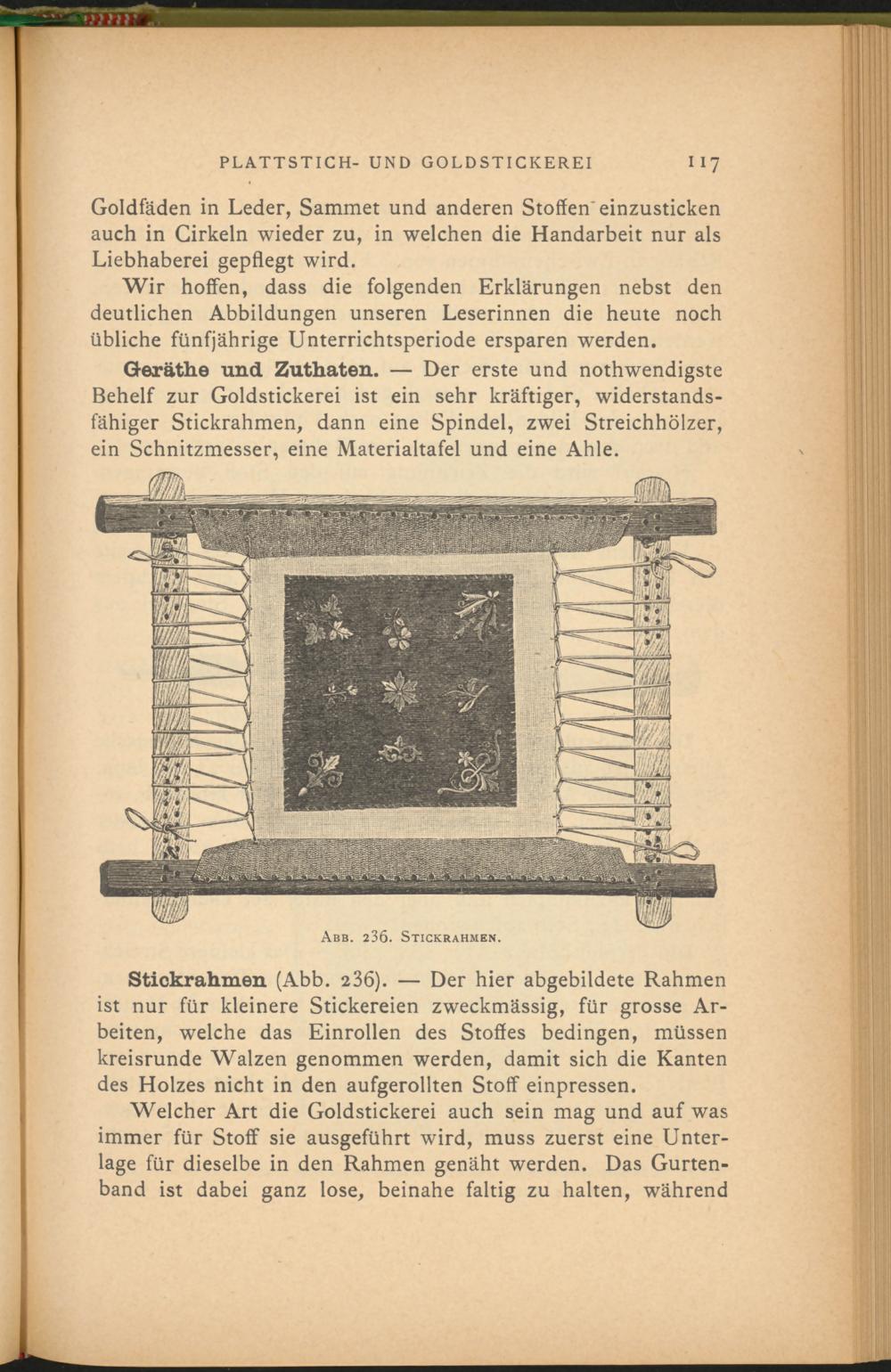 Stickrahmen (Abb. 236 ). — Der hier abgebildete Rahmen ist nur für kleinere Stickereien zweckmässig, für grosse Arbeiten, welche das Einrollen des Stoffes bedingen, müssen kreisrunde Walzen genommen werden, damit sich die Kanten des Holzes nicht in den aufgerollten Stoff einpressen.