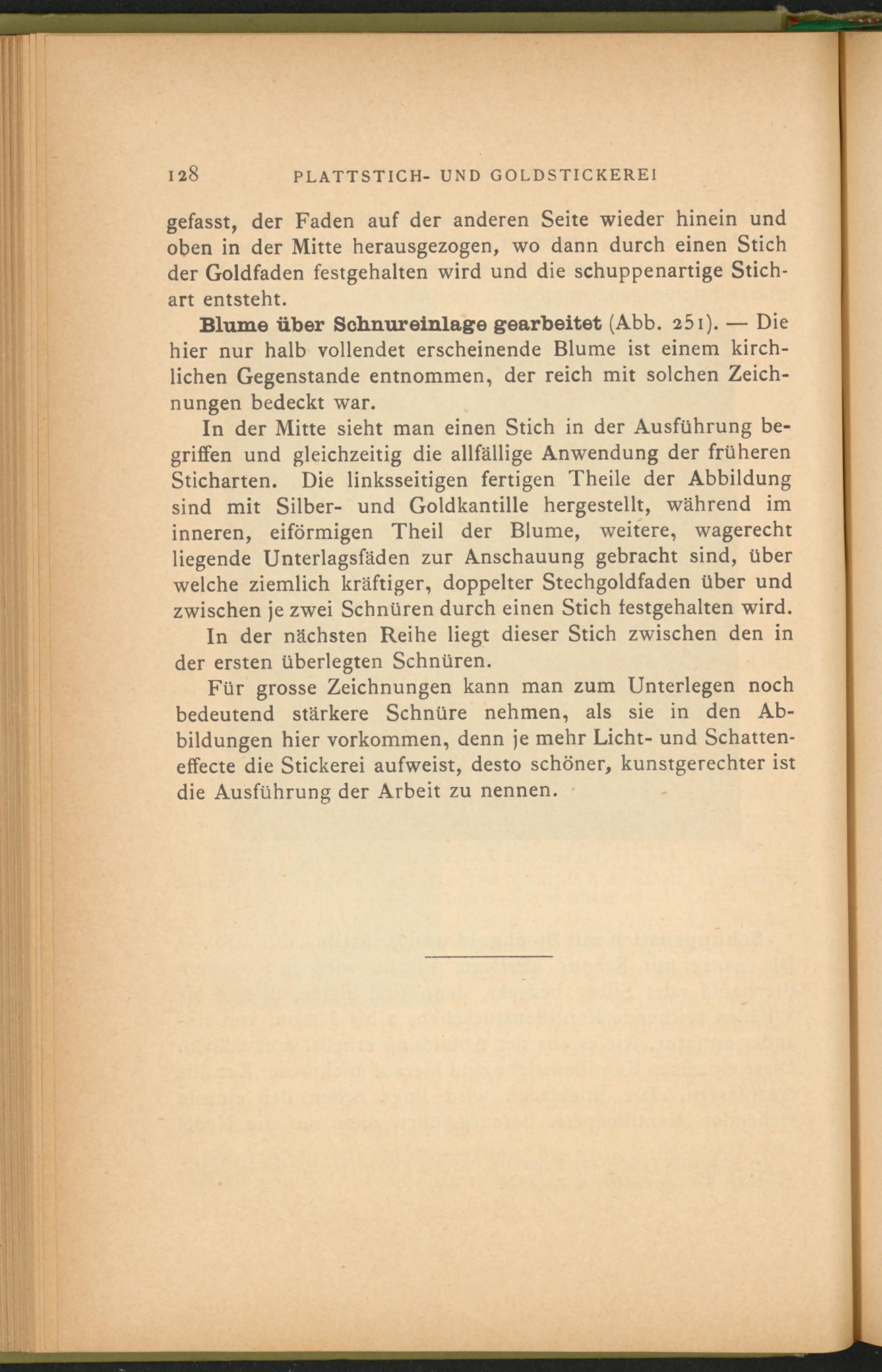 gefasst, der Faden auf der anderen Seite wieder hinein und oben in der Mitte herausgezogen, wo dann durch einen Stich der Goldfaden festgehalten wird und die schuppenartige Stichart entsteht.
