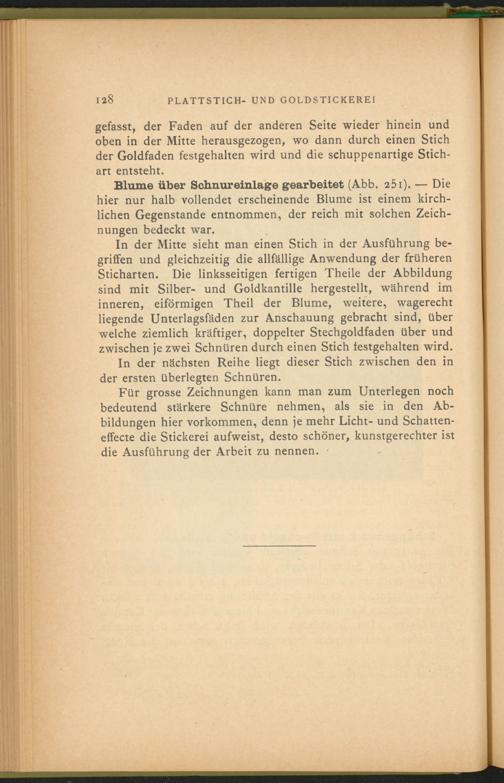 In der Mitte sieht man einen Stich in der Ausführung begriffen und gleichzeitig die allfällige Anwendung der früheren Sticharten. Die linksseitigen fertigen Theile der Abbildung sind mit Silber- und Goldkantille hergestellt, während im inneren, eiförmigen Theil der Blume, weitere, wagerecht liegende Unterlagsfäden zur Anschauung gebracht sind, über welche ziemlich kräftiger, doppelter Stechgoldfaden über und zwischen je zwei Schnüren durch einen Stich festgehalten wird.