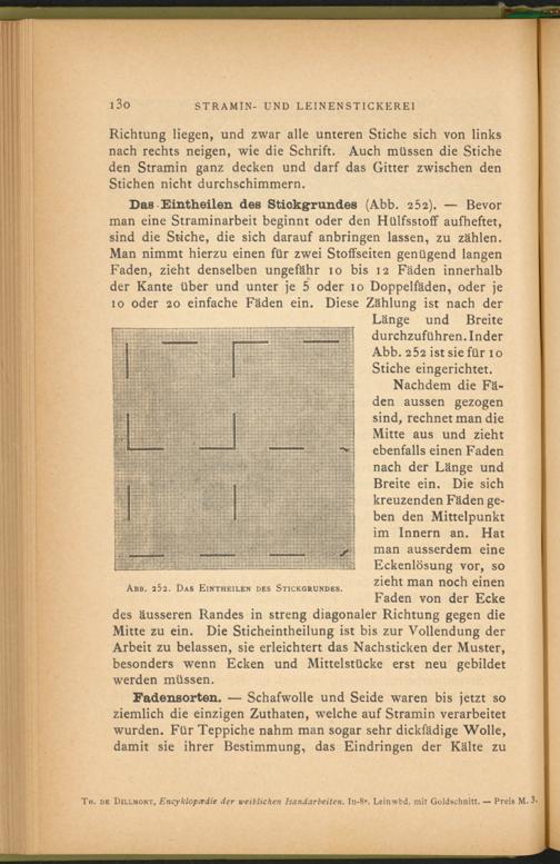 Das Eintheilen des Stiokgrundes (Abb. 252). — Bevor man eine Straminarbeit beginnt oder den Hülfsstoff aufheftet, sind die Stiche, die sich darauf anbringen lassen, zu zählen. Man nimmt hierzu einen für zwei Stoffseiten genügend langen Faden, zieht denselben ungefähr 10 bis 12 Fäden innerhalb der Kante über und unter je 5 oder 10 Doppelfäden, oder je 10 oder 20 einfache Fäden ein. Diese Zählung ist nach der