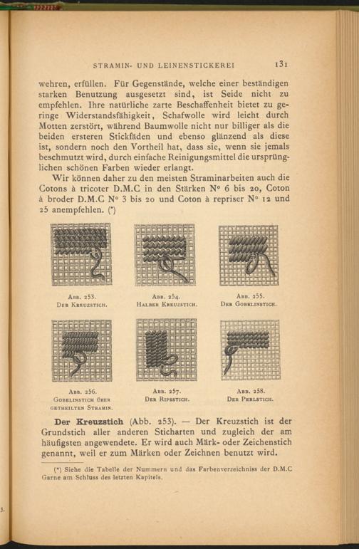 Der Kreuzstich (Abb. 253 ). — Der Kreuzstich ist der Grundstich aller anderen Sticharten und zugleich der am häufigsten angewendete. Er wird auch Märk- oder Zeichenstich genannt, weil er zum Märken oder Zeichnen benutzt wird.