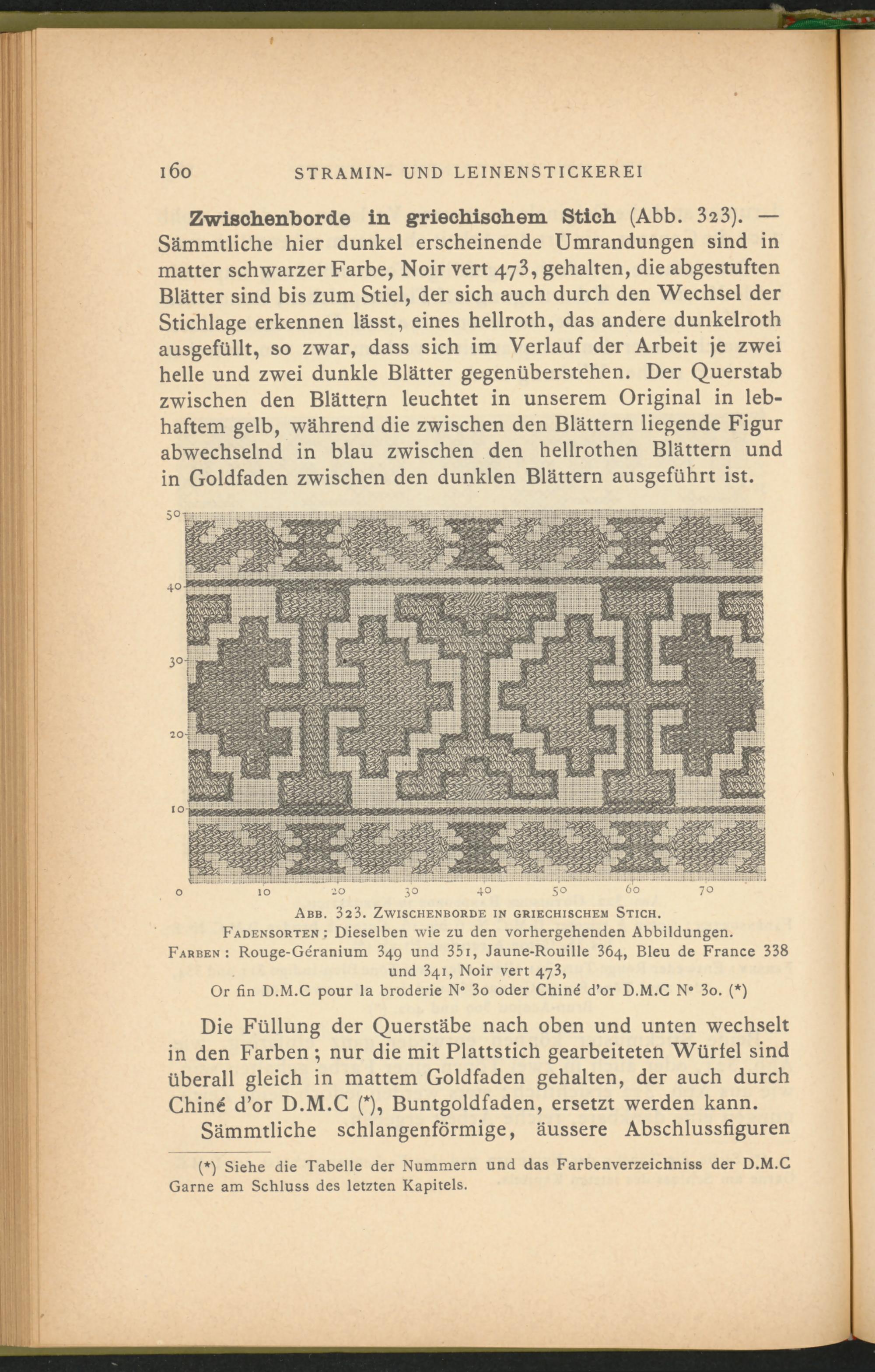 Zwisohenborde in griechischem Stich (Abb. 323 ). — Sämmtliche hier dunkel erscheinende Umrandungen sind in matter schwarzer Farbe, Noir vert 473, gehalten, die abgestuften Blätter sind bis zum Stiel, der sich auch durch den Wechsel der Stichlage erkennen lässt, eines hellroth, das andere dunkelroth ausgefüllt, so zwar, dass sich im Verlauf der Arbeit je zwei helle und zwei dunkle Blätter gegenüberstehen. Der Querstab zwischen den Blättern leuchtet in unserem Original in lebhaftem gelb, während die zwischen den Blättern liegende Figur abwechselnd in blau zwischen den hellrothen Blättern und in Goldfaden zwischen den dunklen Blättern ausgeführt ist.