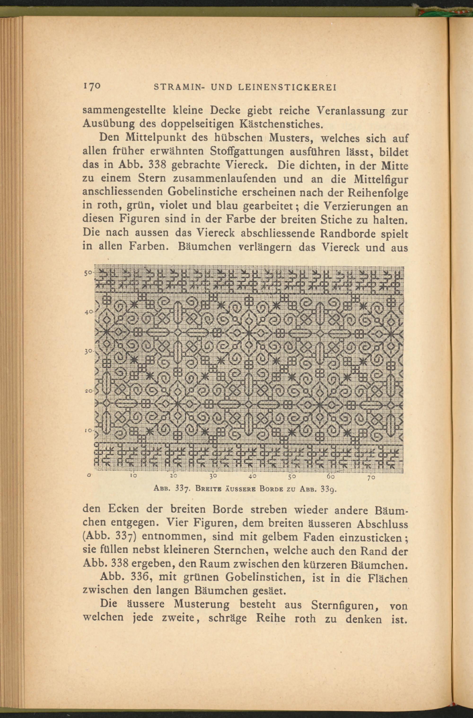 den Ecken der breiten Borde streben wieder andere Bäumchen entgegen. Vier Figuren, dem breiten äusseren Abschluss (Abb. 337) entnommen, sind mit gelbem Faden einzusticken; sie füllen nebst kleineren Sternchen, welche auch den Rand der Abb. 338 ergeben, den Raum zwischen den kürzeren Bäumchen.