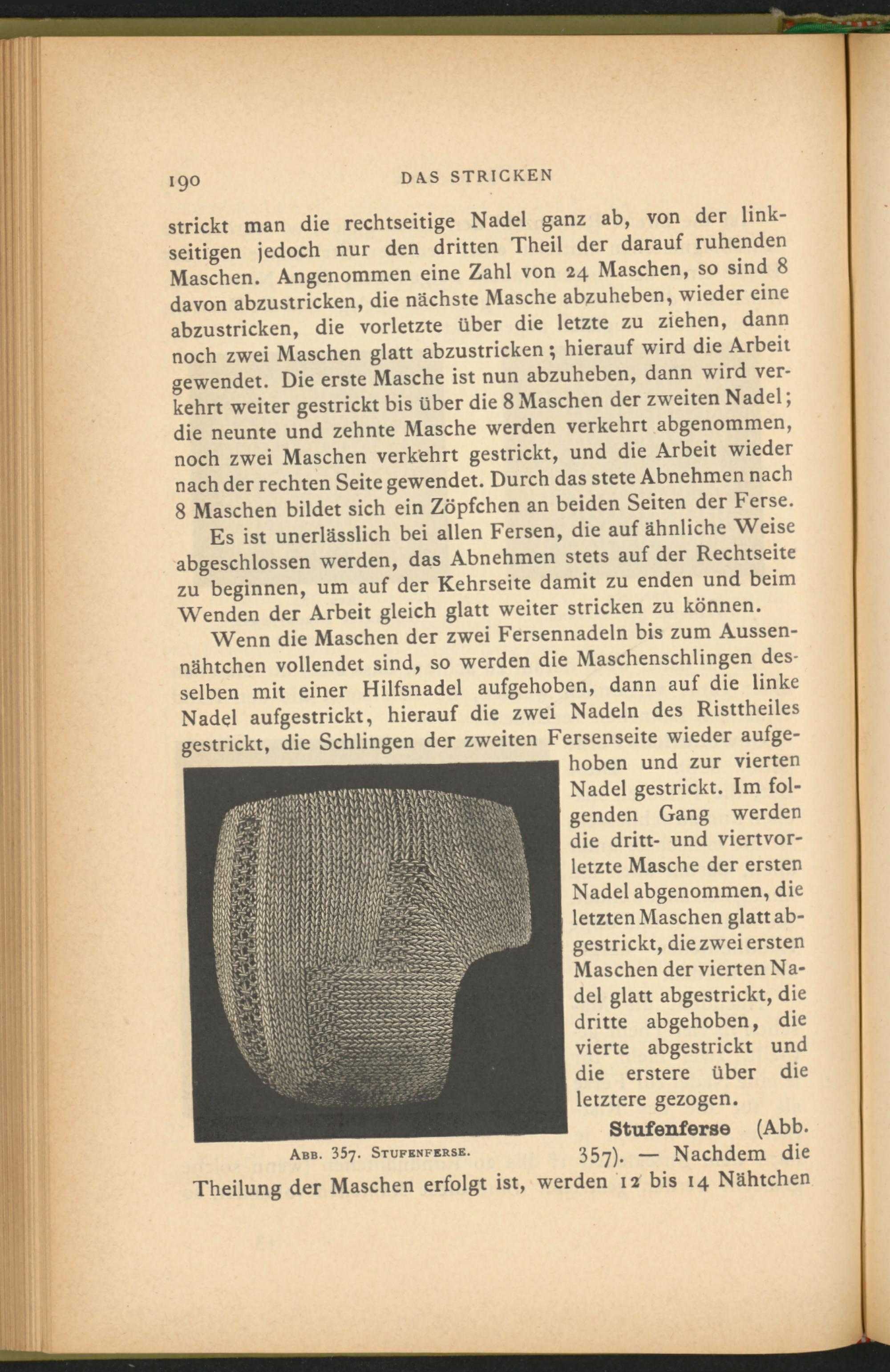strickt man die rechtseitige Nadel ganz ab, von der linkseitigen jedoch nur den dritten Theil der darauf ruhenden Maschen. Angenommen eine Zahl von 24 Maschen, so sind 8 davon abzustricken, die nächste Masche abzuheben, wieder eine abzustricken, die vorletzte über die letzte zu ziehen, dann noch zwei Maschen glatt abzustricken; hierauf wird die Arbeit gewendet. Die erste Masche ist nun abzuheben, dann wird verkehrt weiter gestrickt bis über die 8 Maschen der zweiten Nadel; die neunte und zehnte Masche werden verkehrt abgenommen, noch zwei Maschen verkehrt gestrickt, und die Arbeit wieder nach der rechten Seite gewendet. Durch das stete Abnehmen nach 8 Maschen bildet sich ein Zöpfchen an beiden Seiten der Ferse.