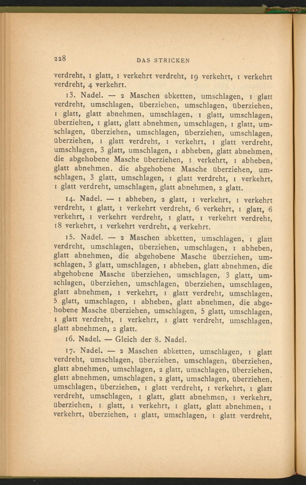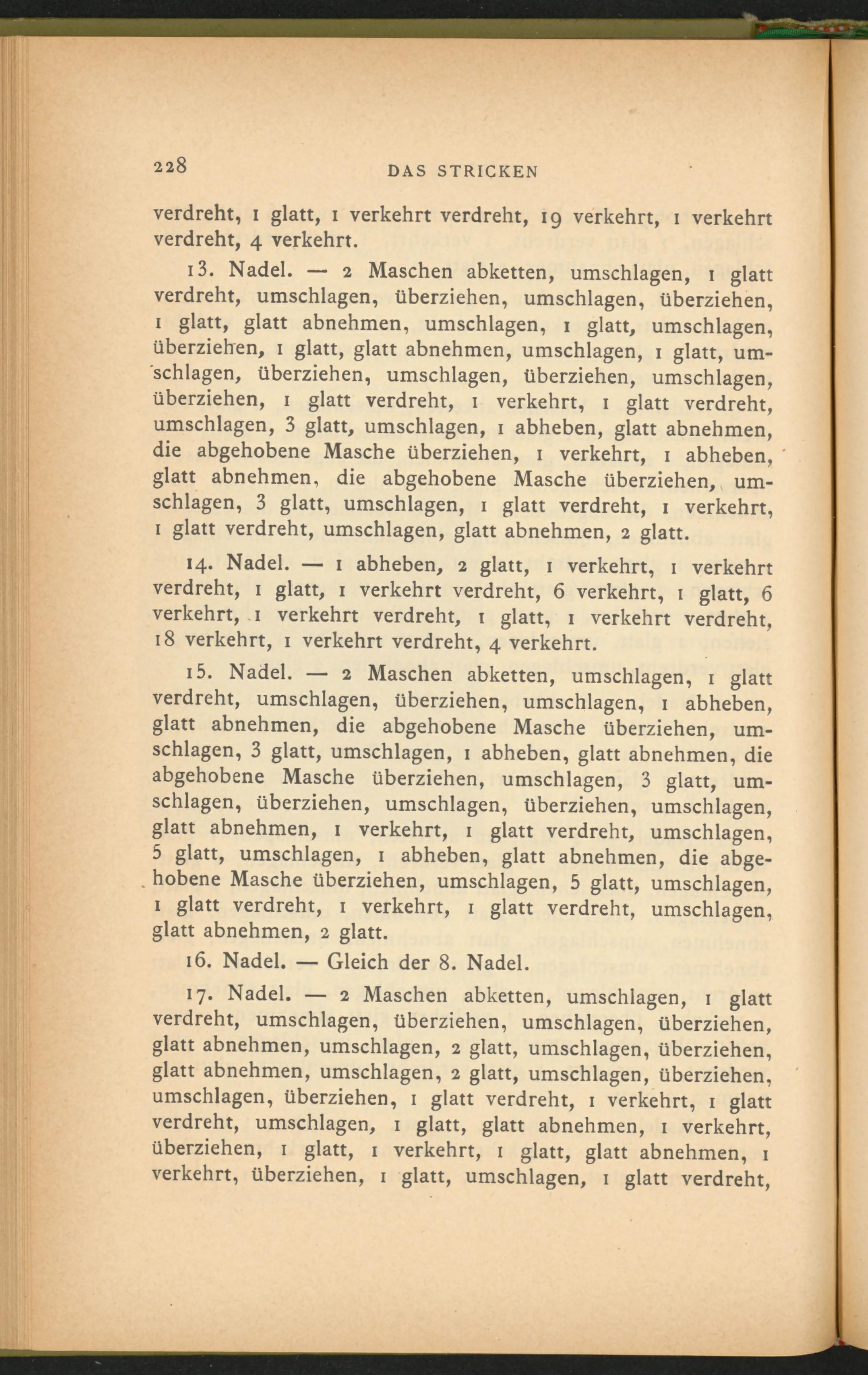 17. Nadel. — 2 Maschen abketten, umschlagen, 1 glatt verdreht, umschlagen, überziehen, umschlagen, überziehen, glatt abnehmen, umschlagen, 2 glatt, umschlagen, überziehen, glatt abnehmen, umschlagen, 2 glatt, umschlagen, überziehen, umschlagen, überziehen, 1 glatt verdreht, 1 verkehrt, 1 glatt verdreht, umschlagen, 1 glatt, glatt abnehmen, 1 verkehrt, überziehen, 1 glatt, 1 verkehrt, 1 glatt, glatt abnehmen, 1 verkehrt, überziehen, 1 glatt, umschlagen, 1 glatt verdreht,