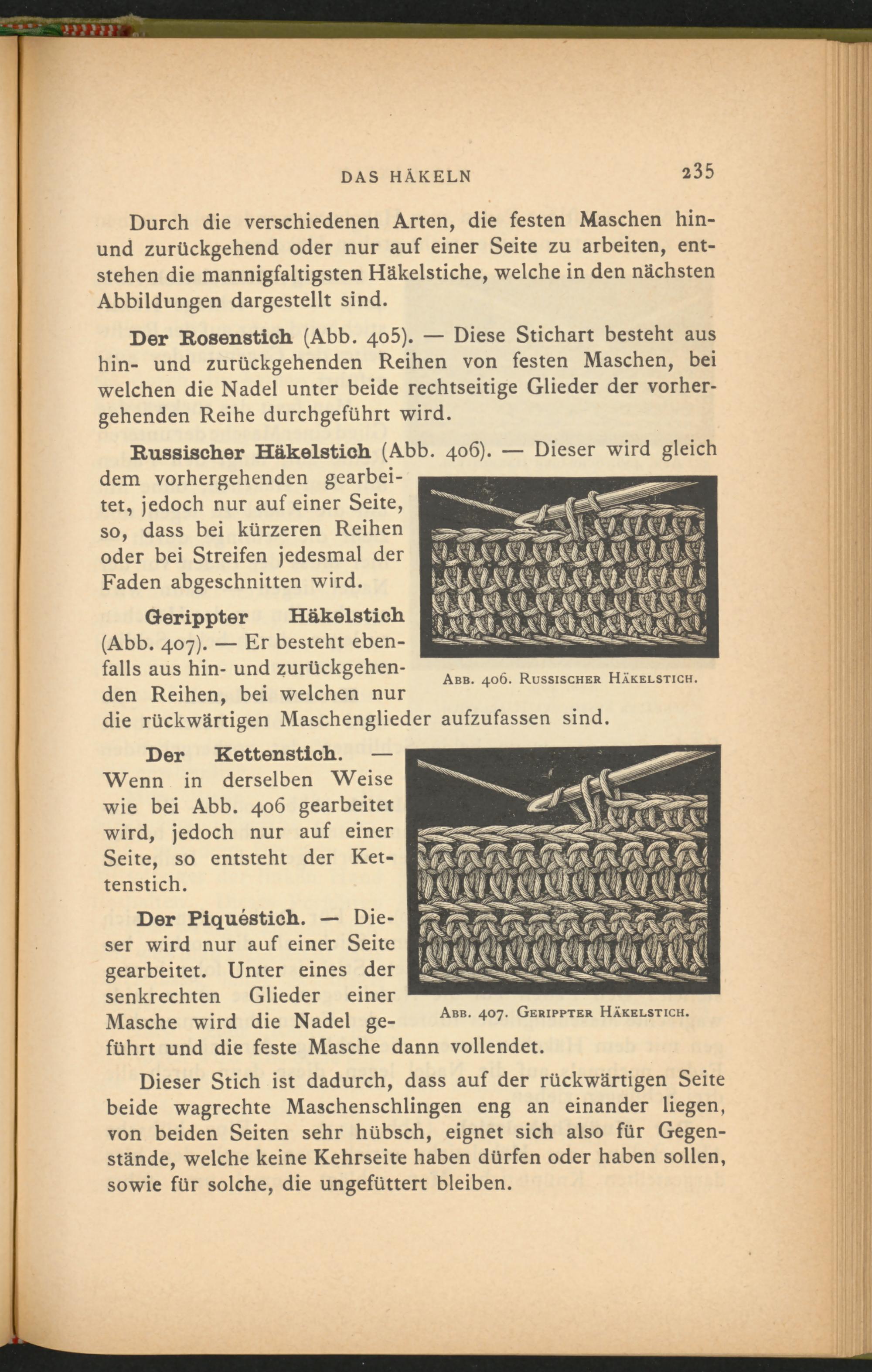 Der Rosenstich (Abb. 405). — Diese Stichart besteht aus hin- und zurückgehenden Reihen von festen Maschen, bei welchen die Nadel unter beide rechtseitige Glieder der vorhergehenden Reihe durchgeführt wird.