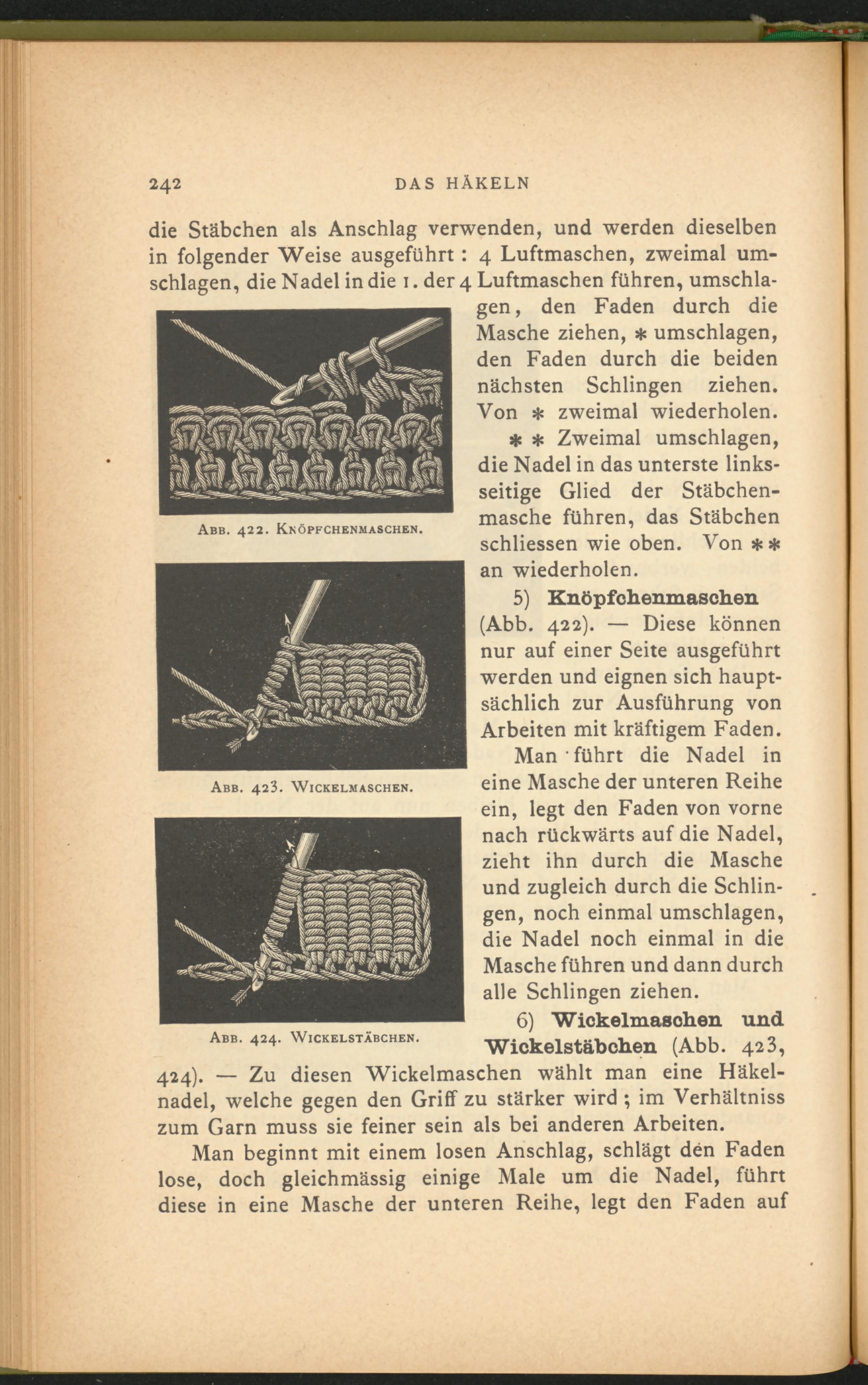 424). — Zu diesen Wickelmaschen wählt man eine Häkelnadel, welche gegen den Griff zu stärker wird ; im Verhältniss zum Garn muss sie feiner sein als bei anderen Arbeiten.