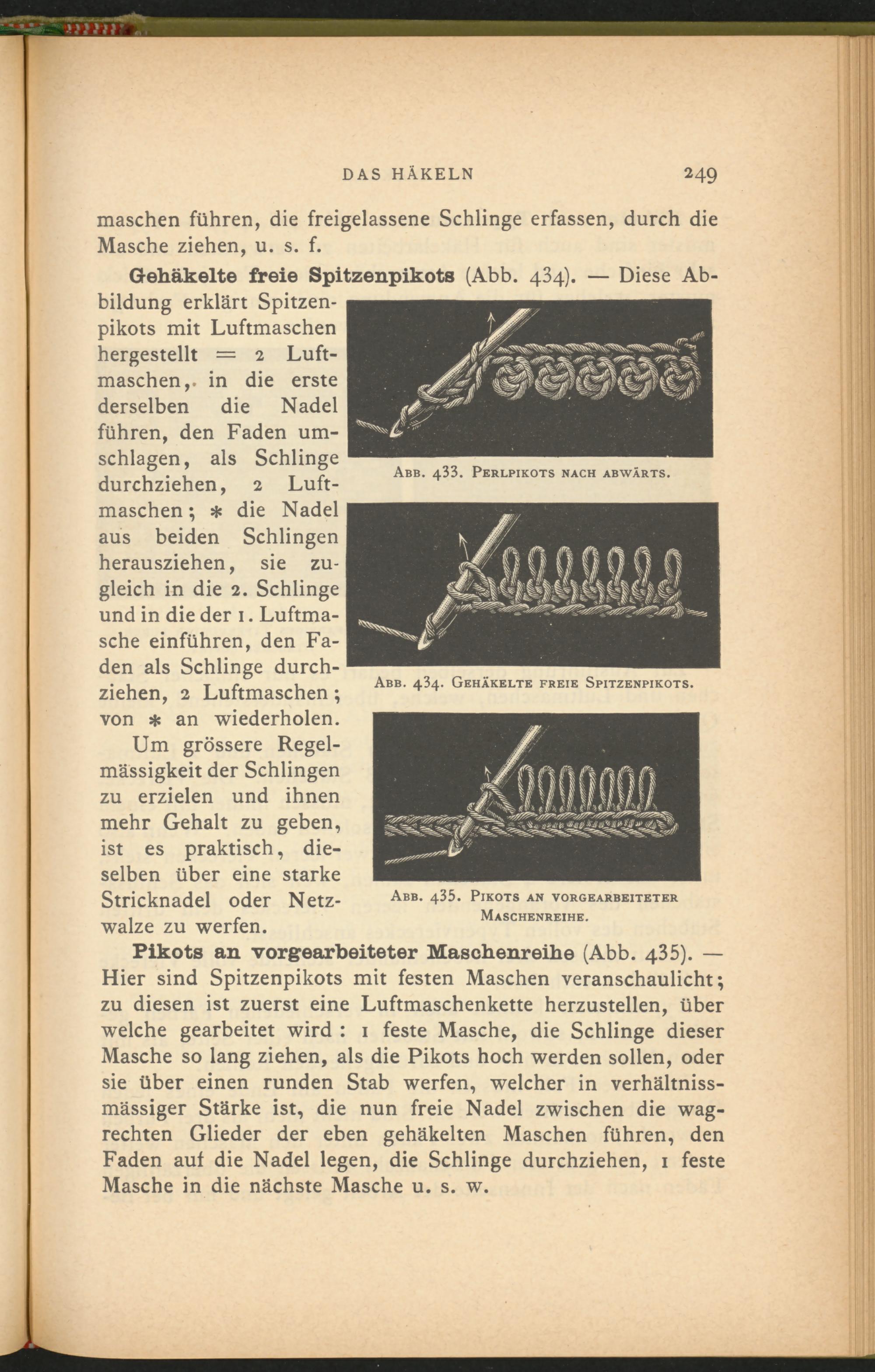 Pikots an vorgearbeiteter Maschenreihe (Abb. 435). — Hier sind Spitzenpikots mit festen Maschen veranschaulicht; zu diesen ist zuerst eine Luftmaschenkette herzustellen, über welche gearbeitet wird : 1 feste Masche, die Schlinge dieser Masche so lang ziehen, als die Pikots hoch werden sollen, oder sie über einen runden Stab werfen, welcher in verhältniss- mässiger Stärke ist, die nun freie Nadel zwischen die wagrechten Glieder der eben gehäkelten Maschen führen, den Faden auf die Nadel legen, die Schlinge durchziehen, 1 feste Masche in die nächste Masche u. s. w.