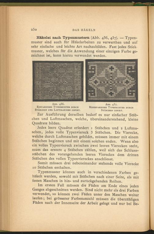 Häkelei nach Typenmustern (Abb. 436 , 437). — Typenmuster sind auch für Häkelarbeiten zu verwerthen und auf sehr einfache und leichte Art nachzubilden. Fast jedes Stickmuster, welches für die Anwendung einer einzigen Farbe gezeichnet ist, kann hierzu verwendet werden.