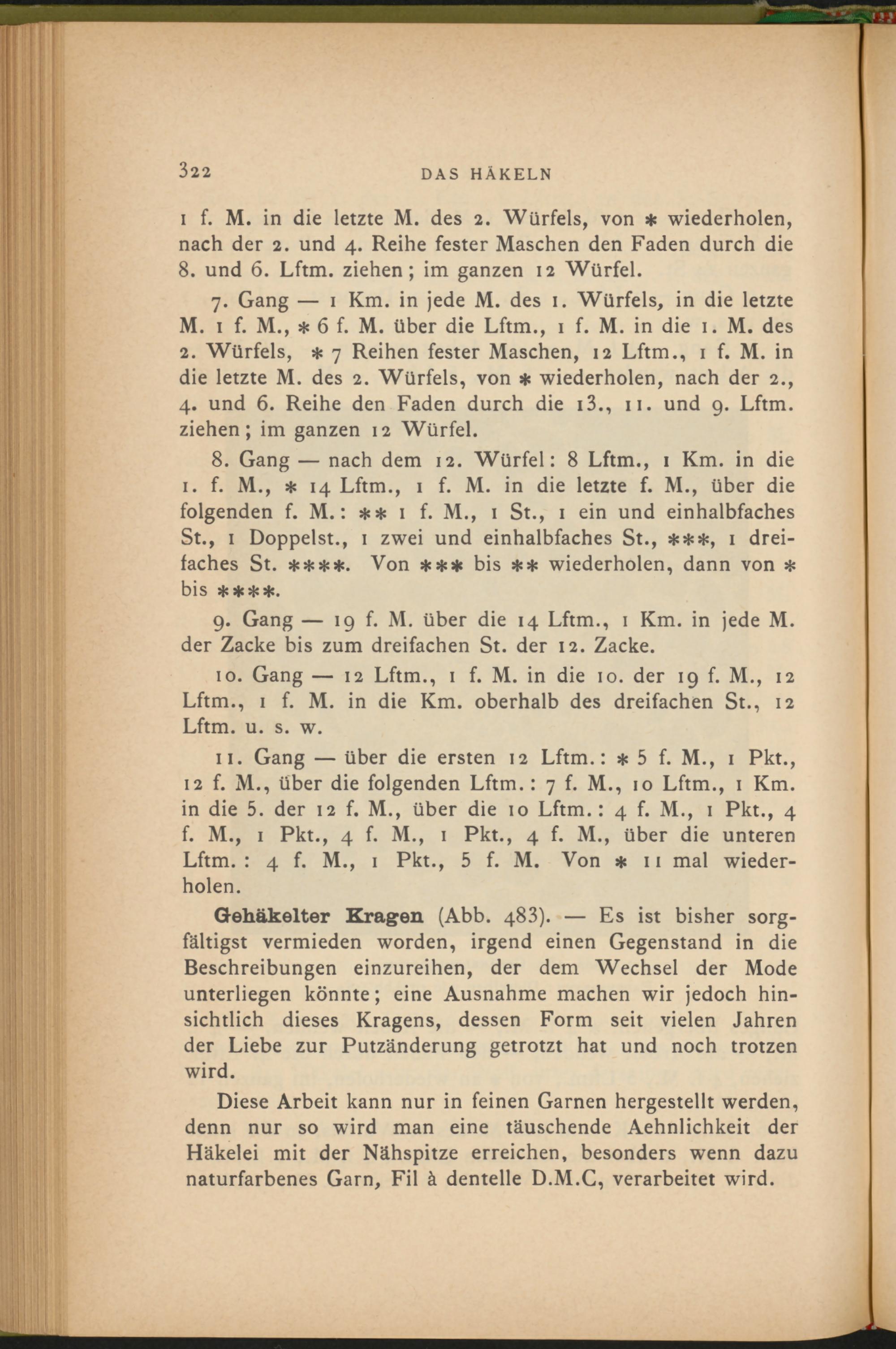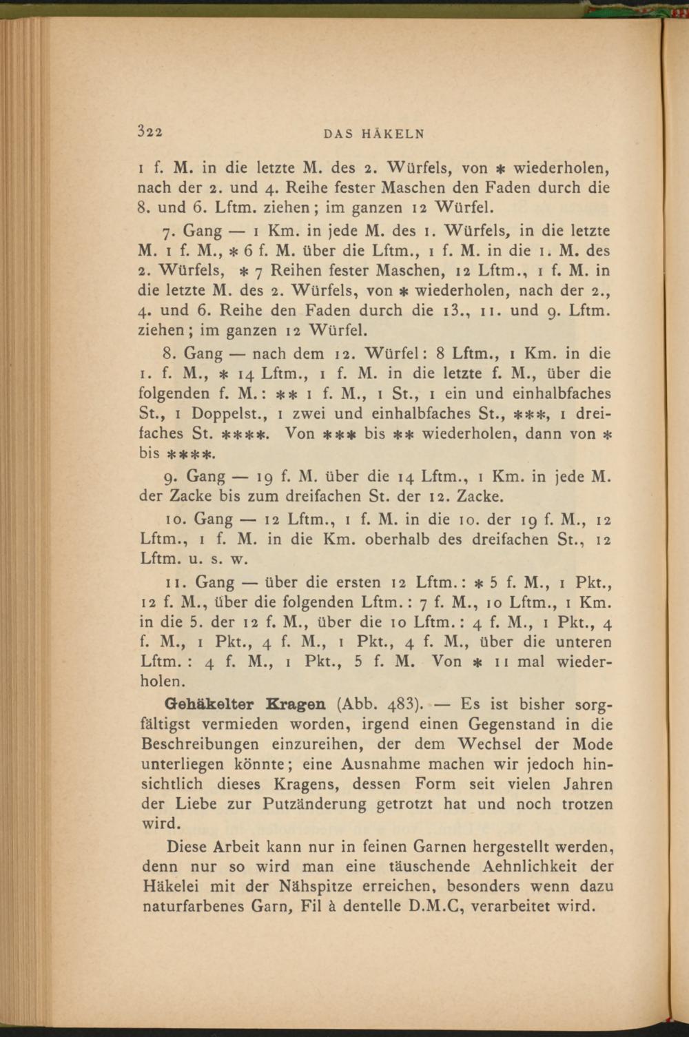 Gehäkelter Kragen (Abb. 483). — Es ist bisher sorg- fältigst vermieden worden, irgend einen Gegenstand in die Beschreibungen einzureihen, der dem Wechsel der Mode unterliegen könnte; eine Ausnahme machen wir jedoch hinsichtlich dieses Kragens, dessen Form seit vielen Jahren der Liebe zur Putzänderung getrotzt hat und noch trotzen wird.