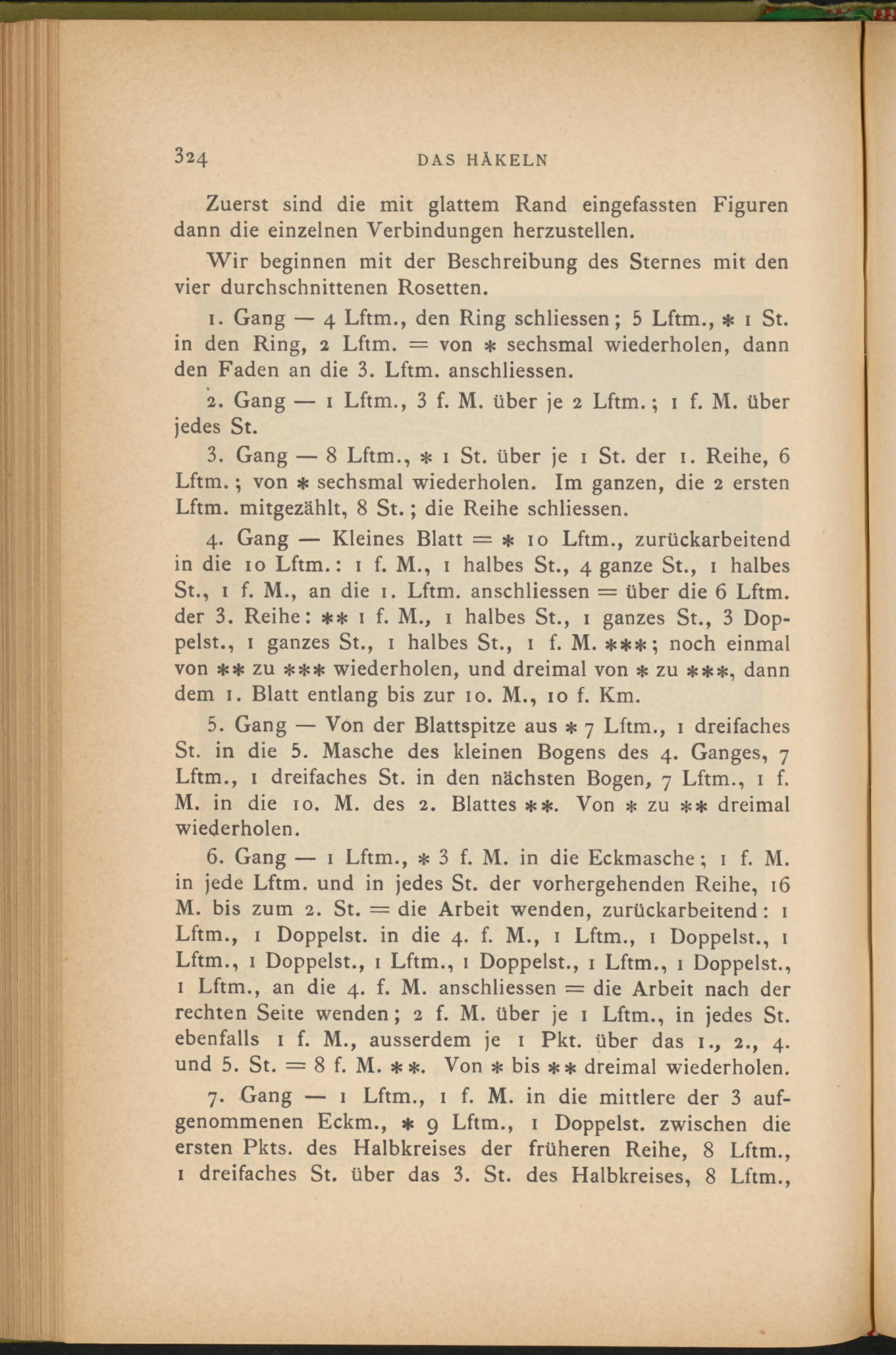 7. Gang — 1 Lftm., 1 f. M. in die mittlere der 3 aufgenommenen Eckm., * 9 Lftm., 1 Doppelst, zwischen die ersten Pkts. des Halbkreises der früheren Reihe, 8 Lftm., 1 dreifaches St. über das 3 . St. des Halbkreises, 8 Lftm.,