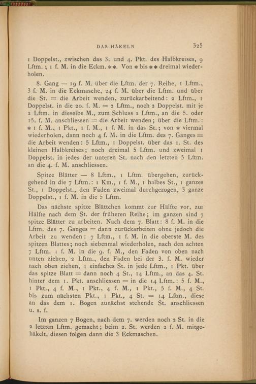 1 Pkt., 4 f. M., 1 Pkt., 4 f. M., 1 Pkt., 5 f. M., 4 St. bis zum nächsten Pkt., 1 Pkt., 4 St. = 14 Lftm., diese an das dem 1. Bogen zunächst stehende St. anschliessen u. s. f.