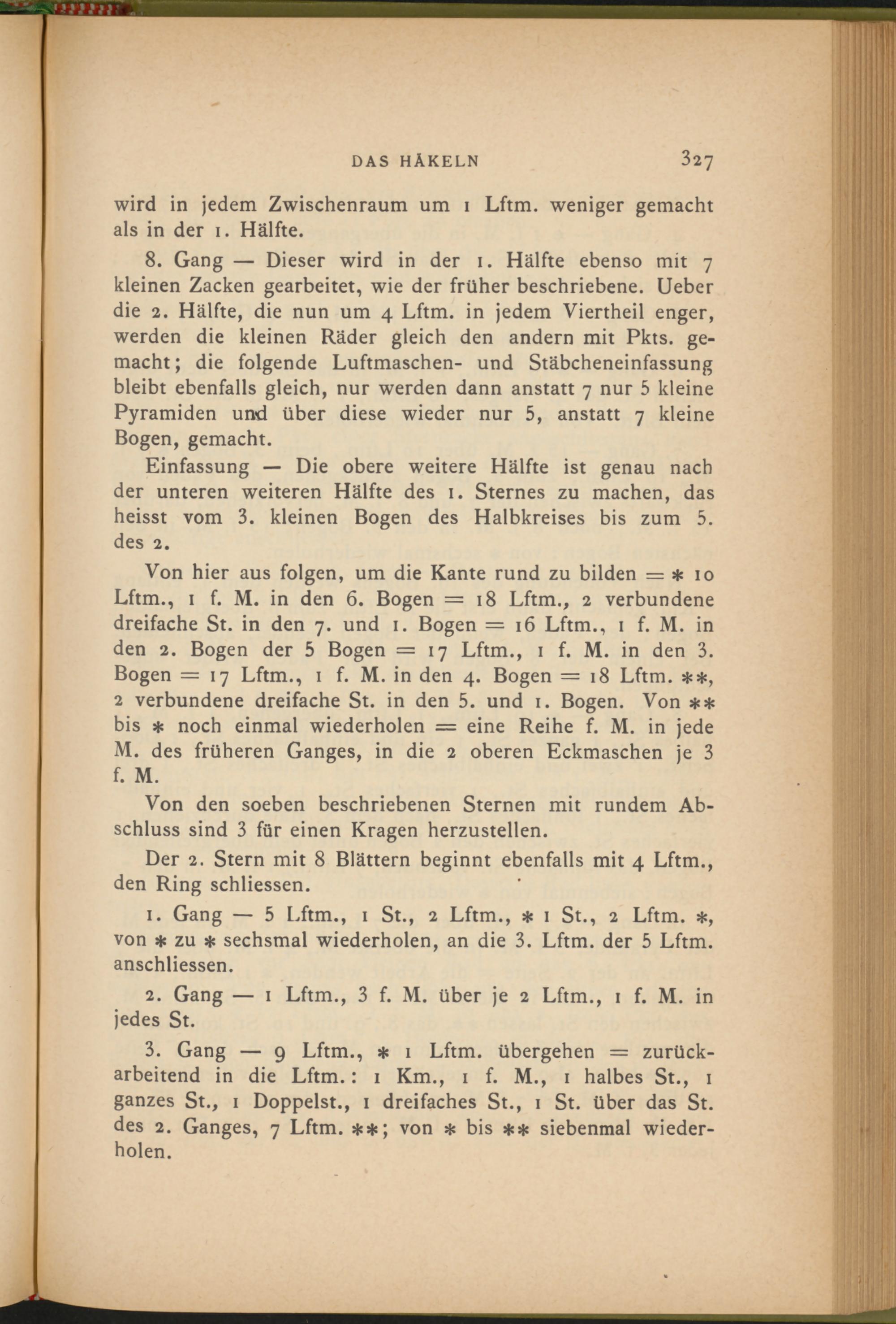 8. Gang — Dieser wird in der i. Hälfte ebenso mit 7 kleinen Zacken gearbeitet, wie der früher beschriebene. Lieber die 2. Hälfte, die nun um 4 Lftm. in jedem Viertheil enger, werden die kleinen Räder gleich den andern mit Pkts. gemacht ; die folgende Luftmaschen- und Stäbcheneinfassung bleibt ebenfalls gleich, nur werden dann anstatt 7 nur 5 kleine Pyramiden und über diese wieder nur 5 , anstatt 7 kleine Bogen, gemacht.