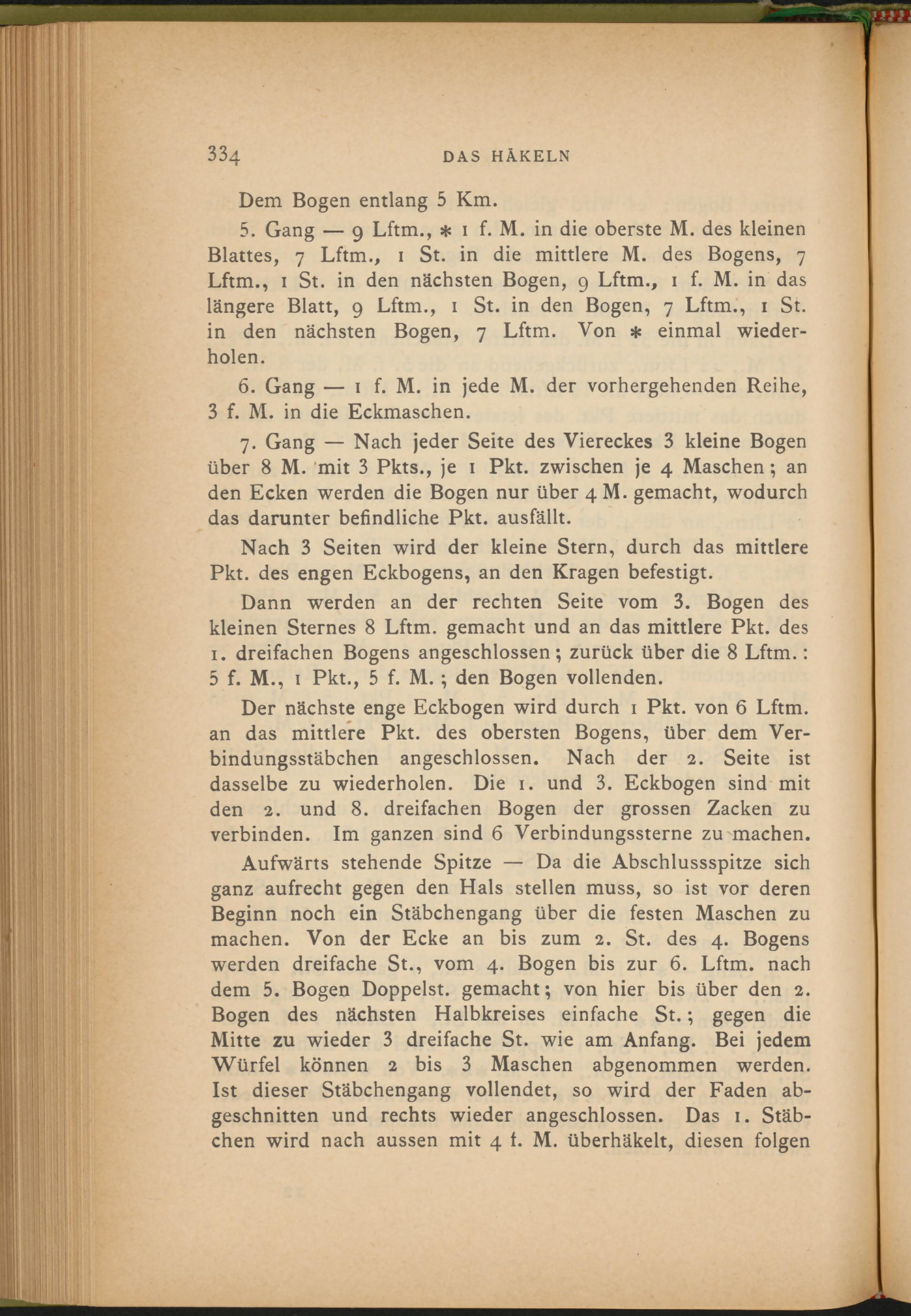 Der nächste enge Eckbogen wird durch 1 Pkt. von 6 Lftm. an das mittlere Pkt. des obersten Bogens, über dem Verbindungsstäbchen angeschlossen. Nach der 2. Seite ist dasselbe zu wiederholen. Die 1. und 3 . Eckbogen sind mit den 2. und 8. dreifachen Bogen der grossen Zacken zu verbinden. Im ganzen sind 6 Verbindungssterne zu machen.