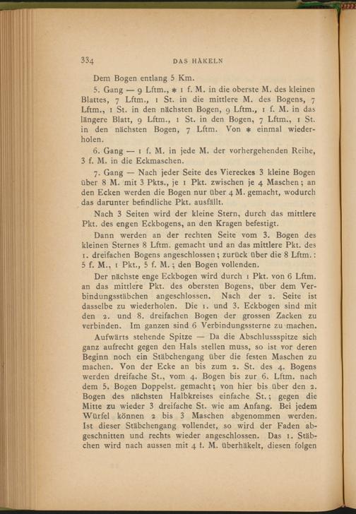 Aufwärts stehende Spitze — Da die Abschlussspitze sich ganz aufrecht gegen den Hals stellen muss, so ist vor deren Beginn noch ein Stäbchengang über die festen Maschen zu machen. Von der Ecke an bis zum 2. St. des 4. Bogens werden dreifache St., vom 4. Bogen bis zur 6. Lftm. nach dem 5 . Bogen Doppelst, gemacht; von hier bis über den 2. Bogen des nächsten Halbkreises einfache St.; gegen die Mitte zu wieder 3 dreifache St. wie am Anfang. Bei jedem Würfel können 2 bis 3 Maschen abgenommen werden. Ist dieser Stäbchengang vollendet, so wird der Faden abgeschnitten und rechts wieder angeschlossen. Das 1. Stäbchen wird nach aussen mit 4 f. M. überhäkelt, diesen folgen