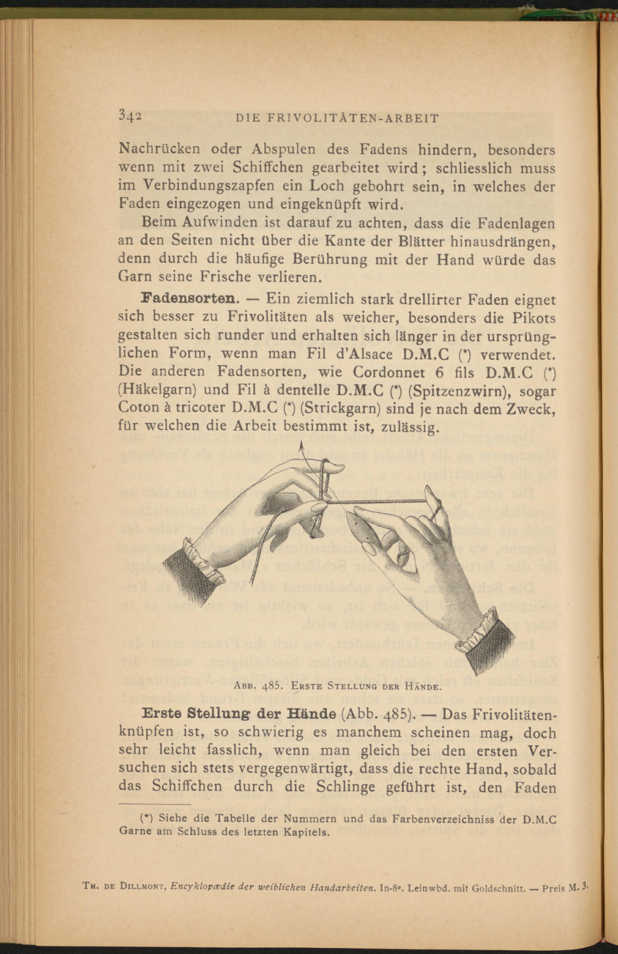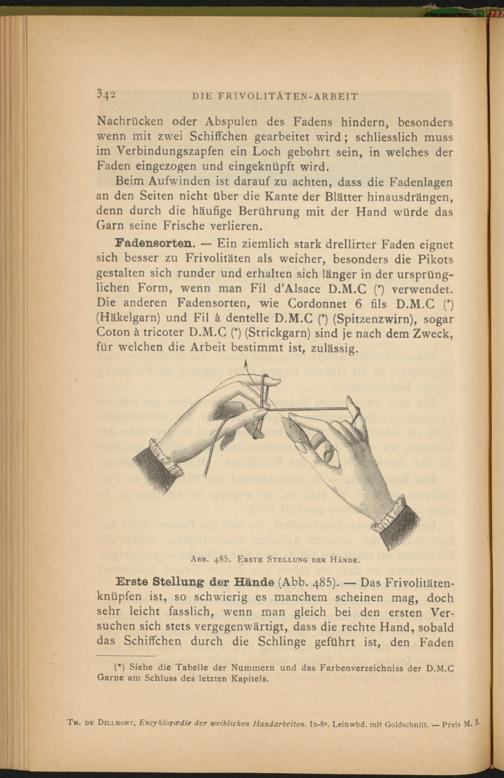 Erste Stellung der Hände (Abb. 485). — Das Frivolitäten- knüpfen ist, so schwierig es manchem scheinen mag, doch sehr leicht fasslich, wenn man gleich bei den ersten Versuchen sich stets vergegenwärtigt, dass die rechte Hand, sobald das Schiffchen durch die Schlinge geführt ist, den Faden