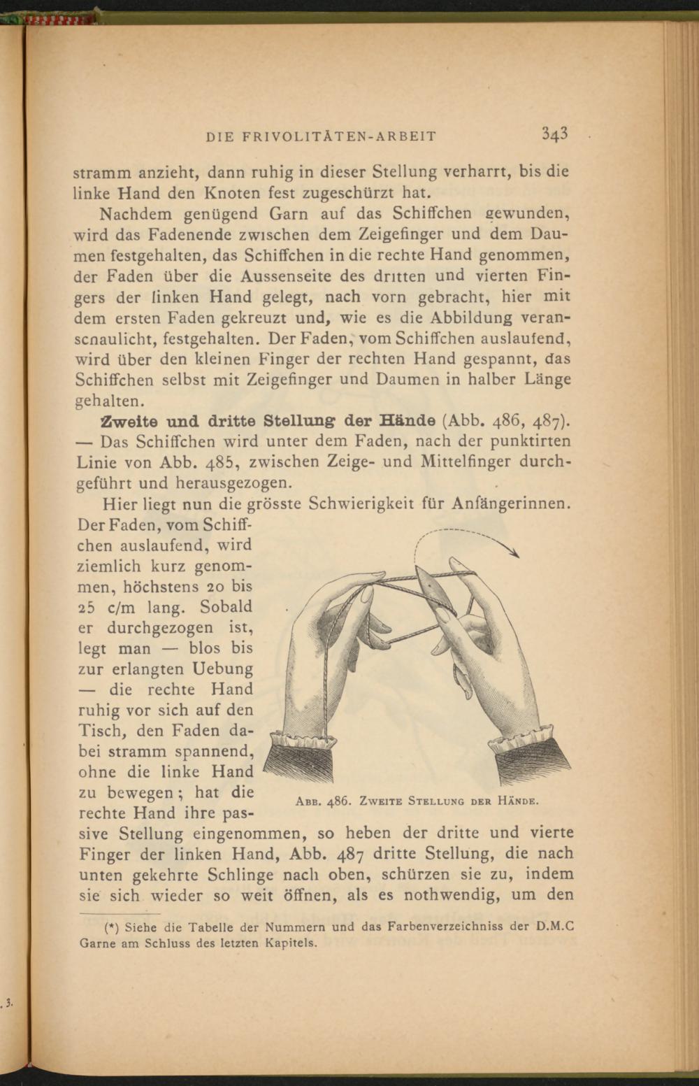 — die rechte Hand ruhig vor sich auf den Tisch, den Faden dabei stramm spannend, ohne die linke Hand zu bewegen; hat die rechte Hand ihre passive Stellung eingenommen, so heben der dritte und vierte Finger der linken Hand, Abb. 487 dritte Stellung, die nach unten gekehrte Schlinge nach oben, schürzen sie zu, indem sie sich wieder so weit öffnen, als es nothwendig, um den (*)