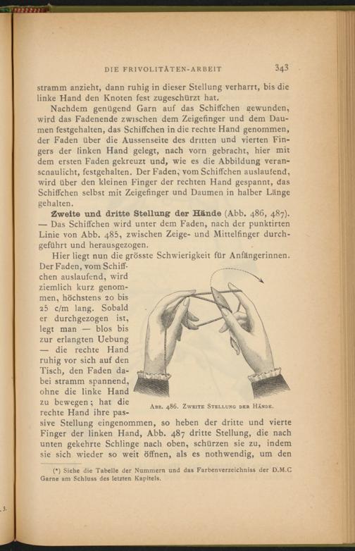 — Das Schiffchen wird unter dem Faden, nach der punktirten Linie von Abb. 485, zwischen Zeige- und Mittelfinger durchgeführt und herausgezogen.