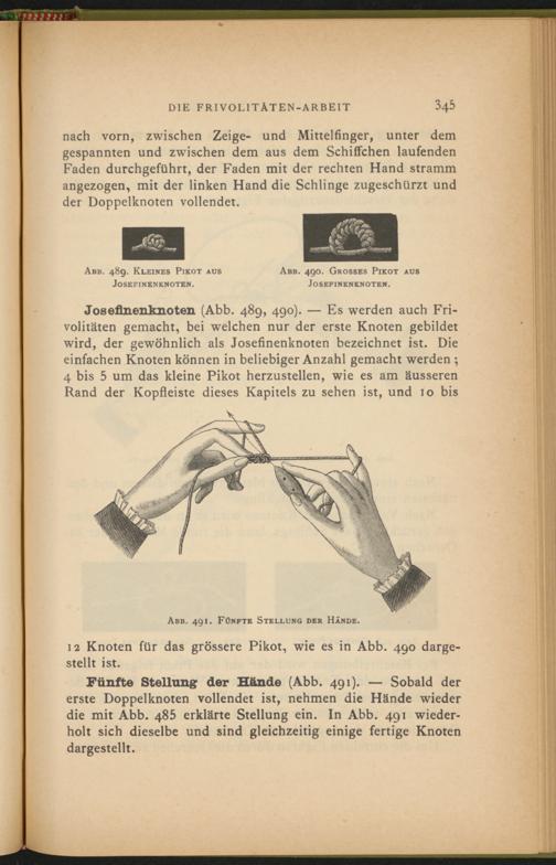 Joseflnenknoten (Abb. 489, 490). — Es werden auch Frivolitäten gemacht, bei welchen nur der erste Knoten gebildet wird, der gewöhnlich als Joseflnenknoten bezeichnet ist. Die einfachen Knoten können in beliebiger Anzahl gemacht werden ; 4 bis 5 um das kleine Pikot herzustellen, wie es am äusseren Rand der Kopfleiste dieses Kapitels zu sehen ist, und 10 bis