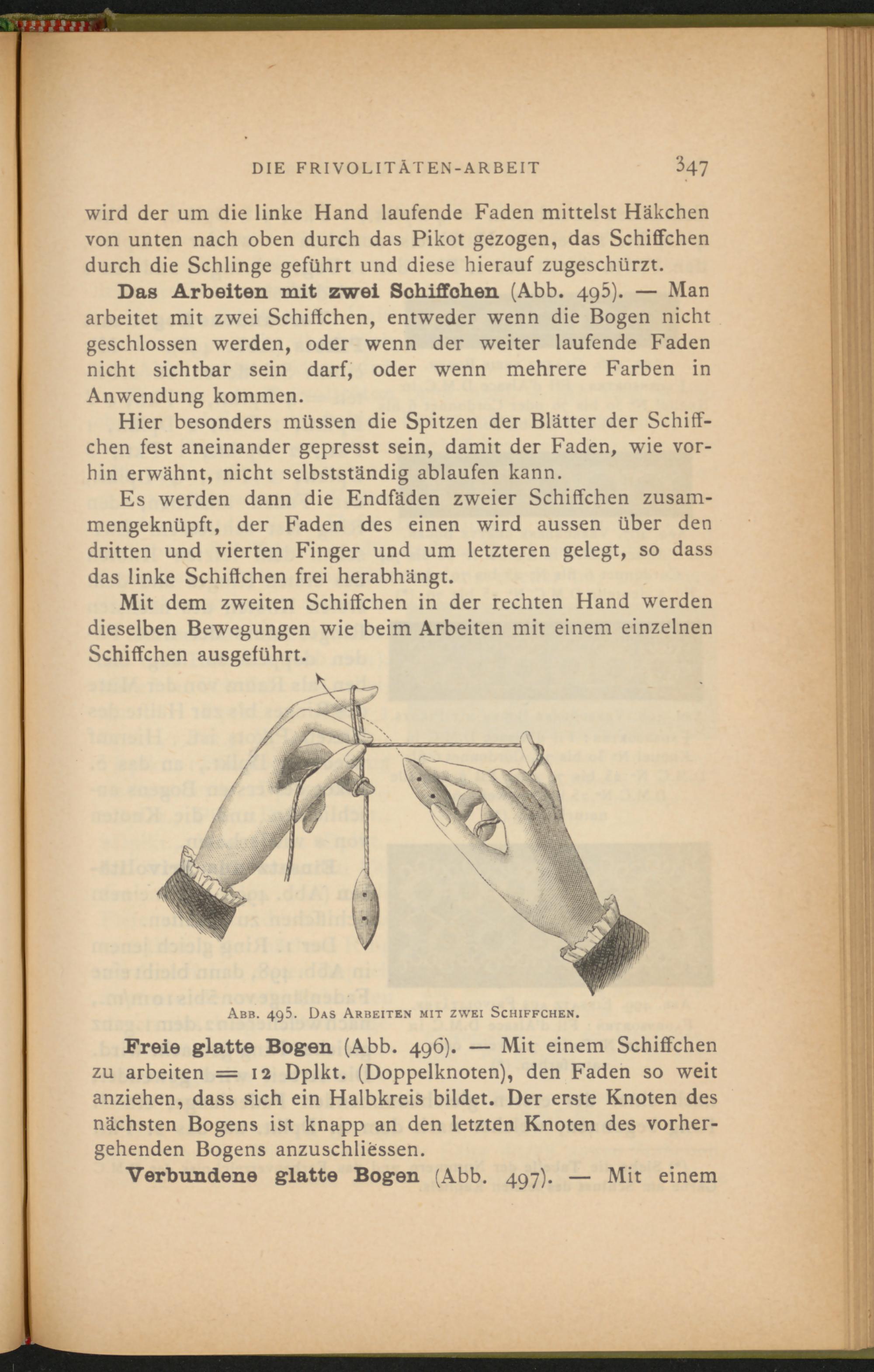 Das Arbeiten mit zwei Sohiffoben (Abb. 495). — Man arbeitet mit zwei Schiffchen, entweder wenn die Bogen nicht geschlossen werden, oder wenn der weiter laufende Faden nicht sichtbar sein darf, oder wenn mehrere Farben in Anwendung kommen.