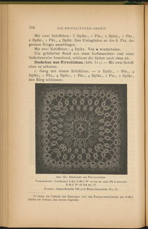 Deckchen aus Frivolitäten (Abb. 511 ). — Mit zwei Schiffchen zu arbeiten.