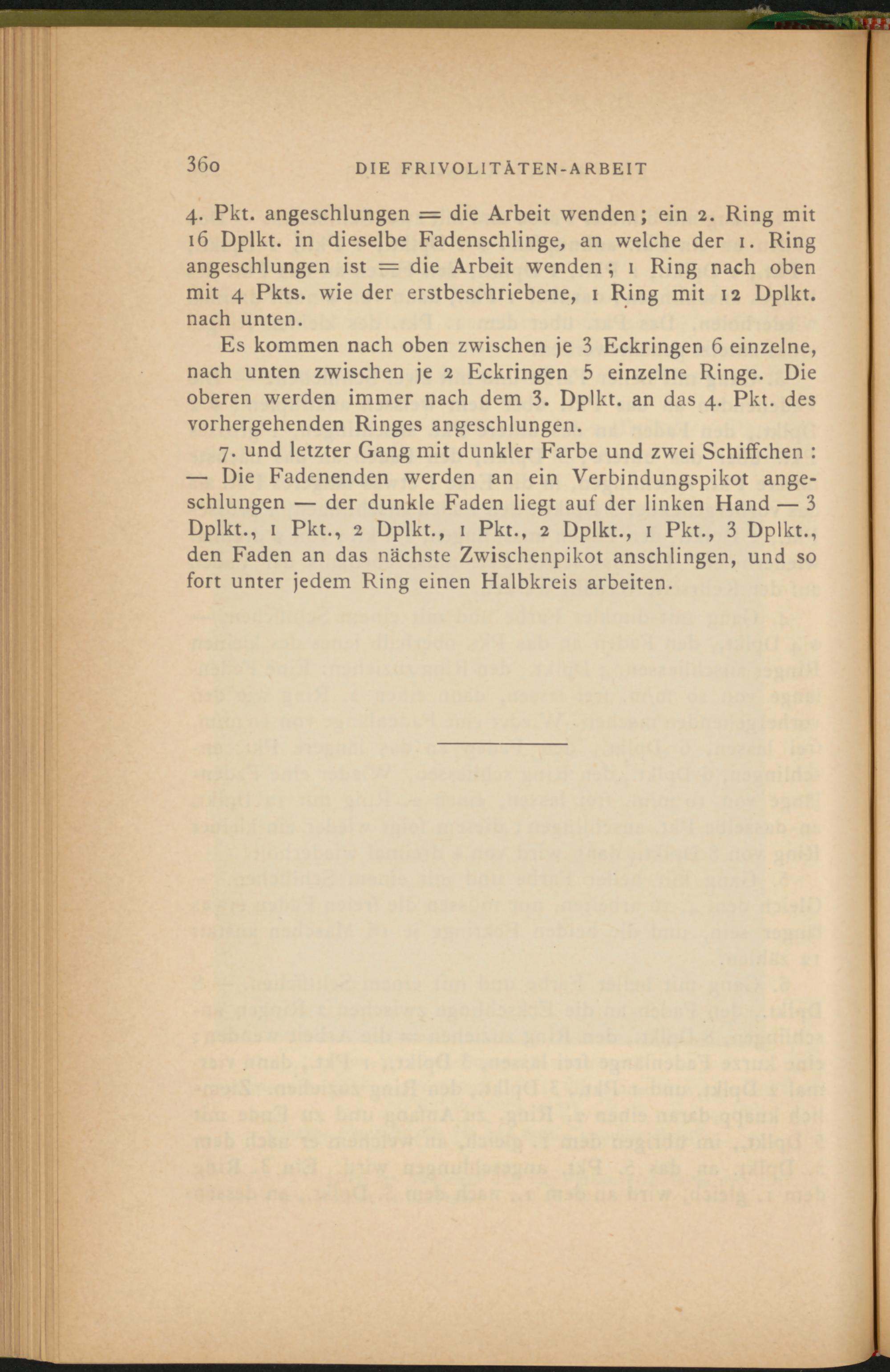 7. und letzter Gang mit dunkler Farbe und zwei Schiffchen : — Die Fadenenden werden an ein Verbindungspikot angeschlungen — der dunkle Faden liegt auf der linken Hand — 3 Dplkt., 1 Pkt., 2 Dplkt., 1 Pkt., 2 Dplkt., 1 Pkt., 3 Dplkt., den Faden an das nächste Zwischenpikot anschlingen, und so fort unter jedem Ring einen Halbkreis arbeiten.