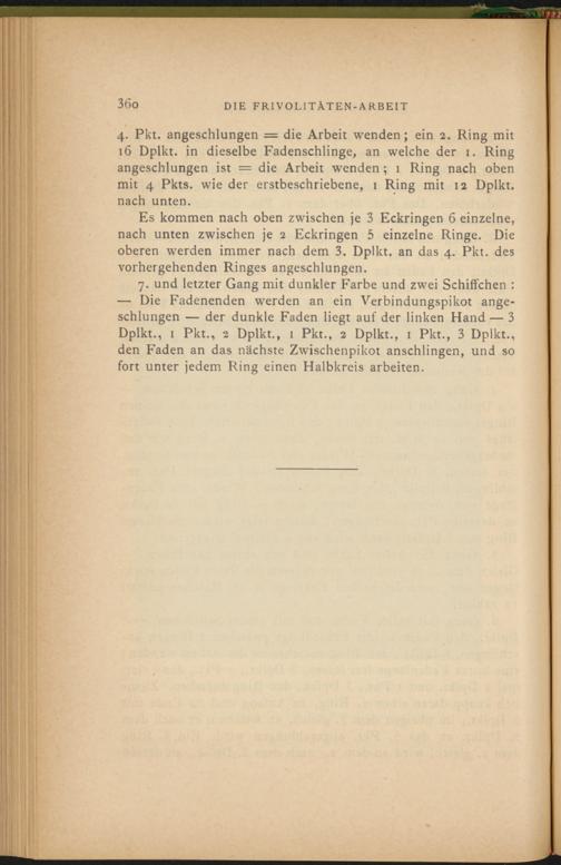 4. Pkt. angeschlungen = die Arbeit wenden; ein 2. Ring mit 16 Dplkt. in dieselbe Fadenschlinge, an welche der 1. Ring angeschlungen ist = die Arbeit wenden ; 1 Ring nach oben mit 4 Pkts. wie der erstbeschriebene, 1 Ring mit 12 Dplkt. nach unten.
