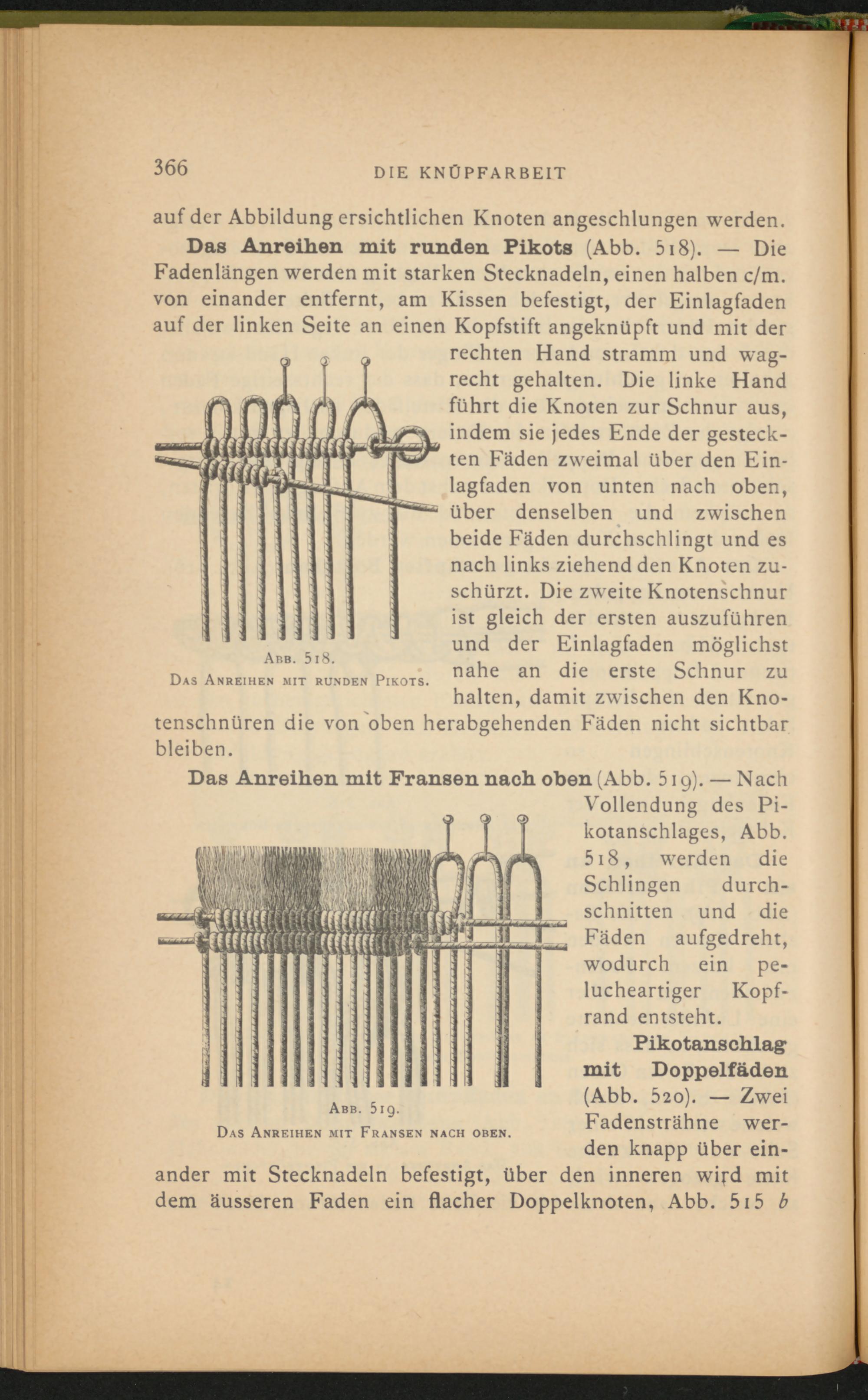 Pikotanschlag mit Doppelfäden (Abb. 520). — Zwei Fadensträhne werden knapp über einander mit Stecknadeln befestigt, über den inneren wird mit dem äusseren Faden ein flacher Doppelknoten, Abb. 5 1 5 b