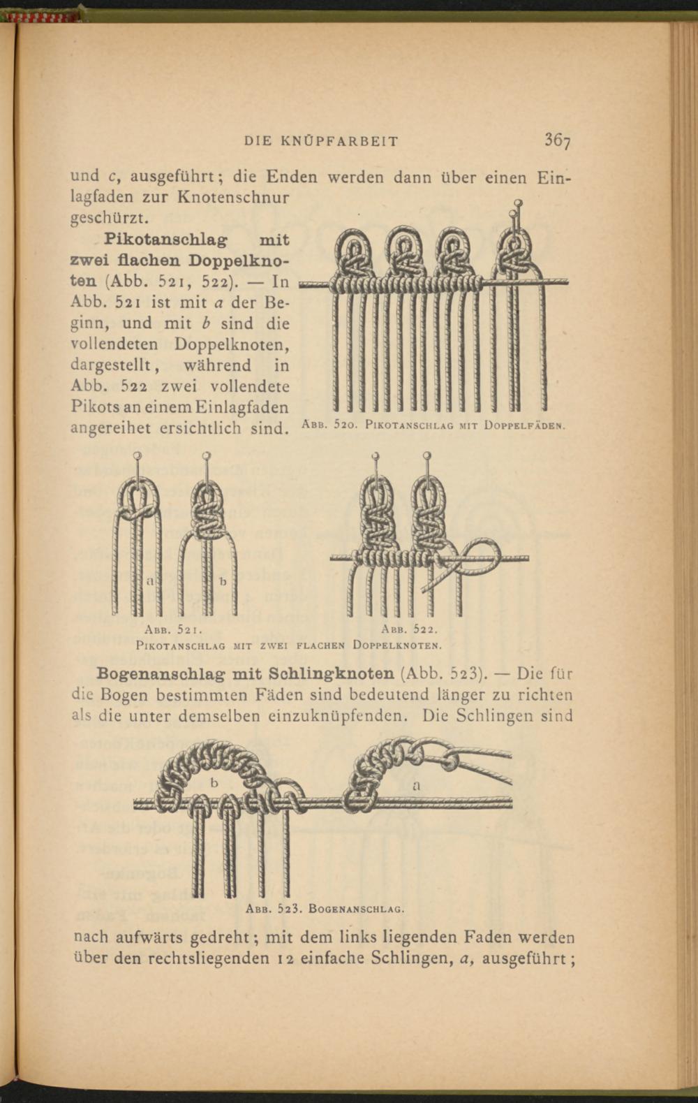 Bogenanschlag mit Schlingknoten (Abb. 523 ). — Die für die Bogen bestimmten Fäden sind bedeutend länger zu richten als die unter demselben einzuknüpfenden. Die Schlingen sind
