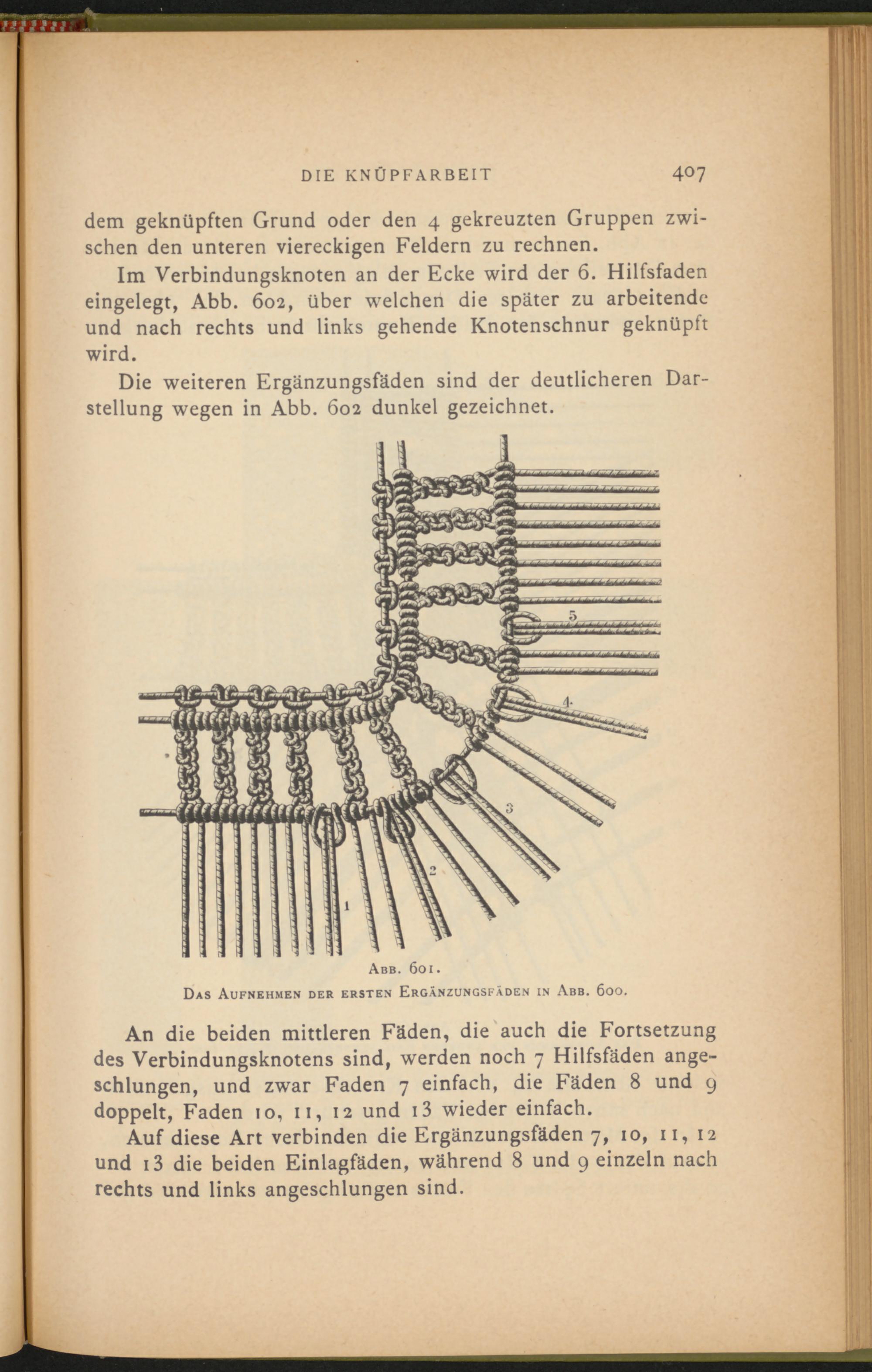 Im Verbindungsknoten an der Ecke wird der 6. Hilfsfaden eingelegt, Abb. 602, über welchen die später zu arbeitende und nach rechts und links gehende Knotenschnur geknüpft wird.