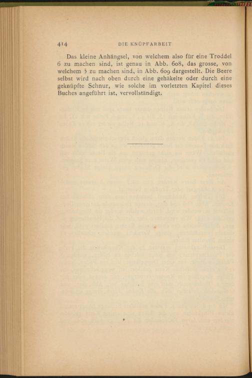 Das kleine Anhängsel, von welchem also für eine Troddel 6 zu machen sind, ist genau in Abb. 608, das grosse, von welchem 5 zu machen sind, in Abb. 609 dargestellt. Die Beere selbst wird nach oben durch eine gehäkelte oder durch eine geknüpfte Schnur, wie solche im vorletzten Kapitel dieses Buches angeführt ist, vervollständigt.