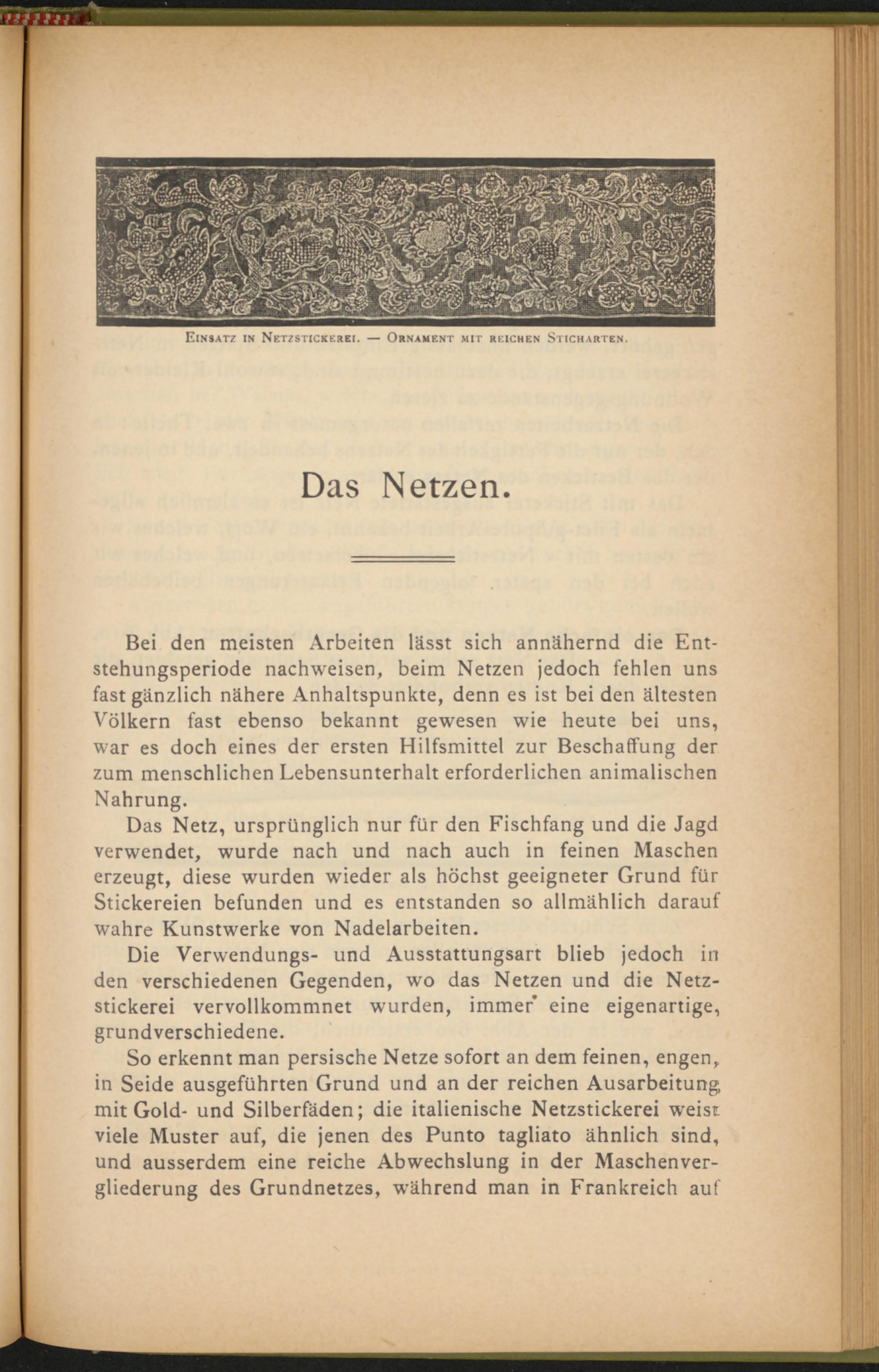 So erkennt man persische Netze sofort an dem feinen, engen, in Seide ausgeführten Grund und an der reichen Ausarbeitung mit Gold- und Silberfäden; die italienische Netzstickerei weist viele Muster auf, die jenen des Punto tagliato ähnlich sind, und ausserdem eine reiche Abwechslung in der Maschenver- gliederung des Grundnetzes, während man in Frankreich auf