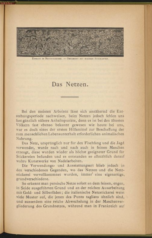 Bei den meisten Arbeiten lässt sich annähernd die Entstehungsperiode nachweisen, beim Netzen jedoch fehlen uns fast gänzlich nähere Anhaltspunkte, denn es ist bei den ältesten Völkern fast ebenso bekannt gewesen wie heute bei uns, war es doch eines der ersten Hilfsmittel zur Beschaffung der zum menschlichen Lebensunterhalt erforderlichen animalischen Nahrung.