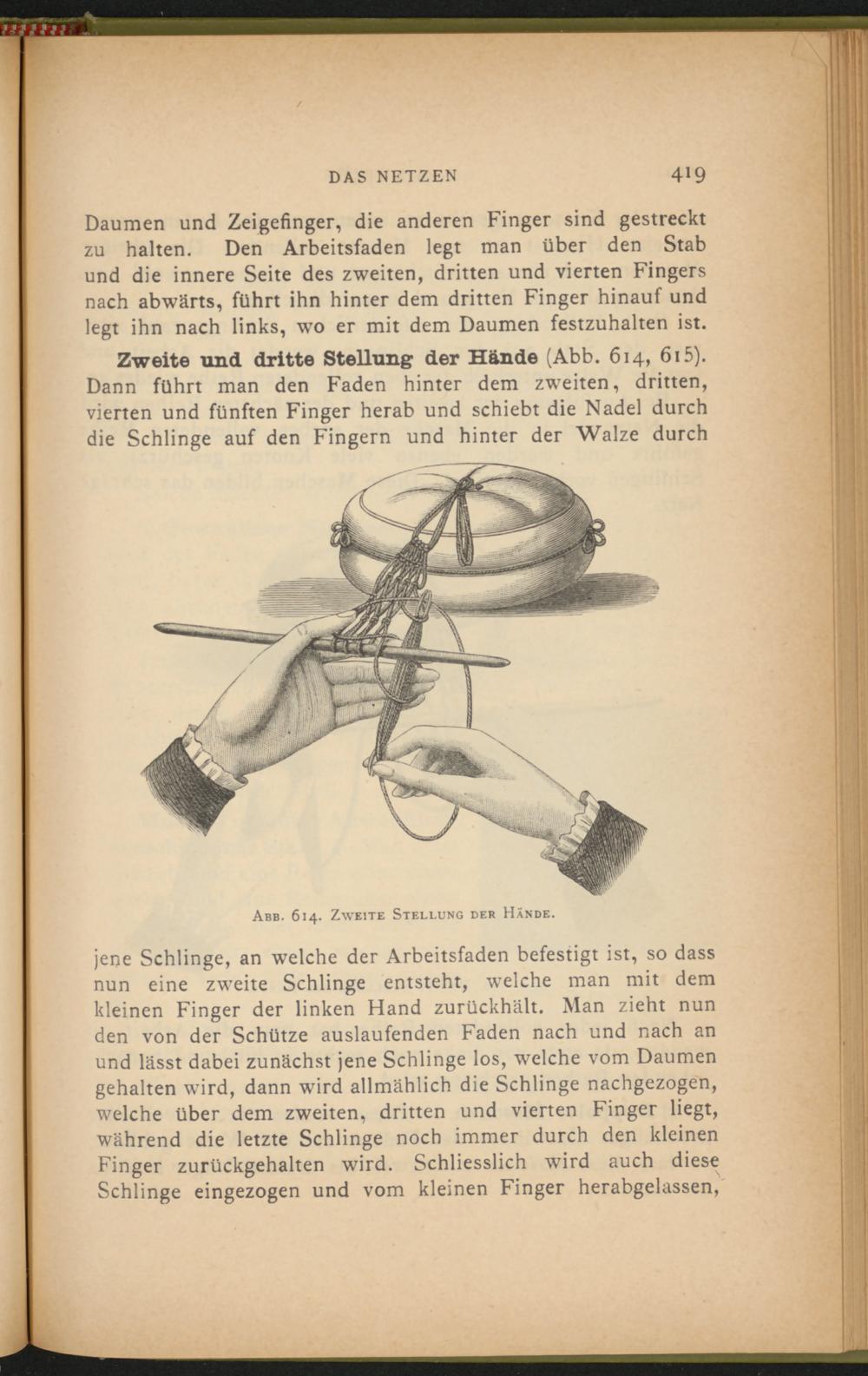 Zweite und dritte Stellung der Hände (Abb. 614, 61 5 ). Dann führt man den Faden hinter dem zweiten, dritten, vierten und fünften Finger herab und schiebt die Nadel durch die Schlinge auf den Fingern und hinter der Walze durch