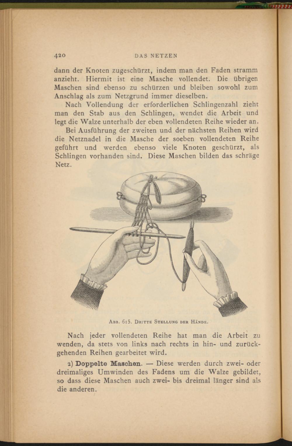 Bei Ausführung der zweiten und der nächsten Reihen wird die Netznadel in die Masche der soeben vollendeten Reihe geführt und werden ebenso viele Knoten geschürzt, als Schlingen vorhanden sind. Diese Maschen bilden das schräge Netz.
