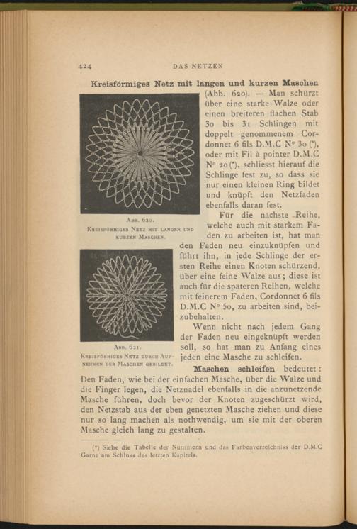 (Abb. 620). — Man schürzt über eine starke Walze oder einen breiteren dachen Stab 3o bis 3i Schlingen mit doppelt genommenem Cor- donnet 6 fils D.M.C N° 3o (*), oder mit Fil ä pointcr D.M.C N° 2o(*), schliesst hierauf die Schlinge fest zu, so dass sie nur einen kleinen Ring bildet und knüpft den Netzfaden ebenfalls daran fest.