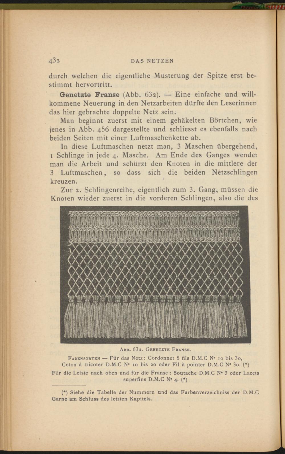 Genetzte Franse (Abb. 632 ). — Eine einfache und willkommene Neuerung in den Netzarbeiten dürfte den Leserinnen das hier gebrachte doppelte Netz sein.