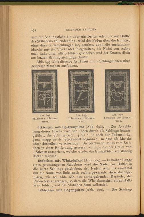 Stäbchen, mit Spitzenpikot (Abb. 698). — Zur Ausführung dieses Pikots wird der Faden durch die Schlinge herausgeführt, die Schlingstiche, 4 bis 5, je nach der Fadenstärke, ganz knapp an der Stecknadel begonnen, so dass die Masche unter denselben verschwindet. Die Stecknadel muss vom Stäbchen in einer Entfernung gesteckt werden, die der Breite von 4 Stichen entspricht, welche wieder die Einlagfäden vollständig decken müssen.