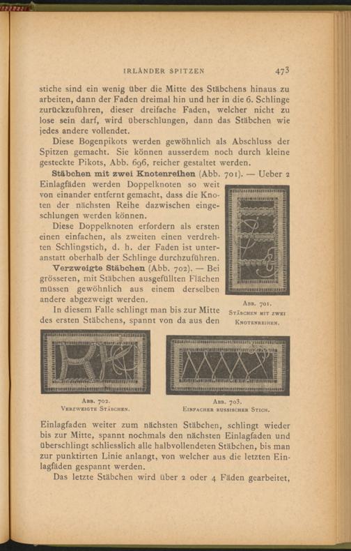 Stäbchen mit zwei Knotenreihen (Abb. 701). — Ueber 2 Einlagfäden werden Doppelknoten so weit von einander entfernt gemacht, dass die Knoten der nächsten Reihe dazwischen eingeschlungen werden können.