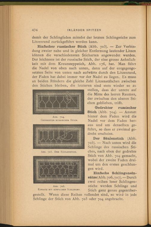 Einfache Schlingeneinsätze (Abb. 706,707). — Durch zwei reihen loser Schlingen- stiche werden Schlinge und Stich ganz genau gegenübergestellt. Wenn diese Reihen vollendet sind, so wird- in jede Schlinge der Stich von Abb. 703 oder 704 angebracht.