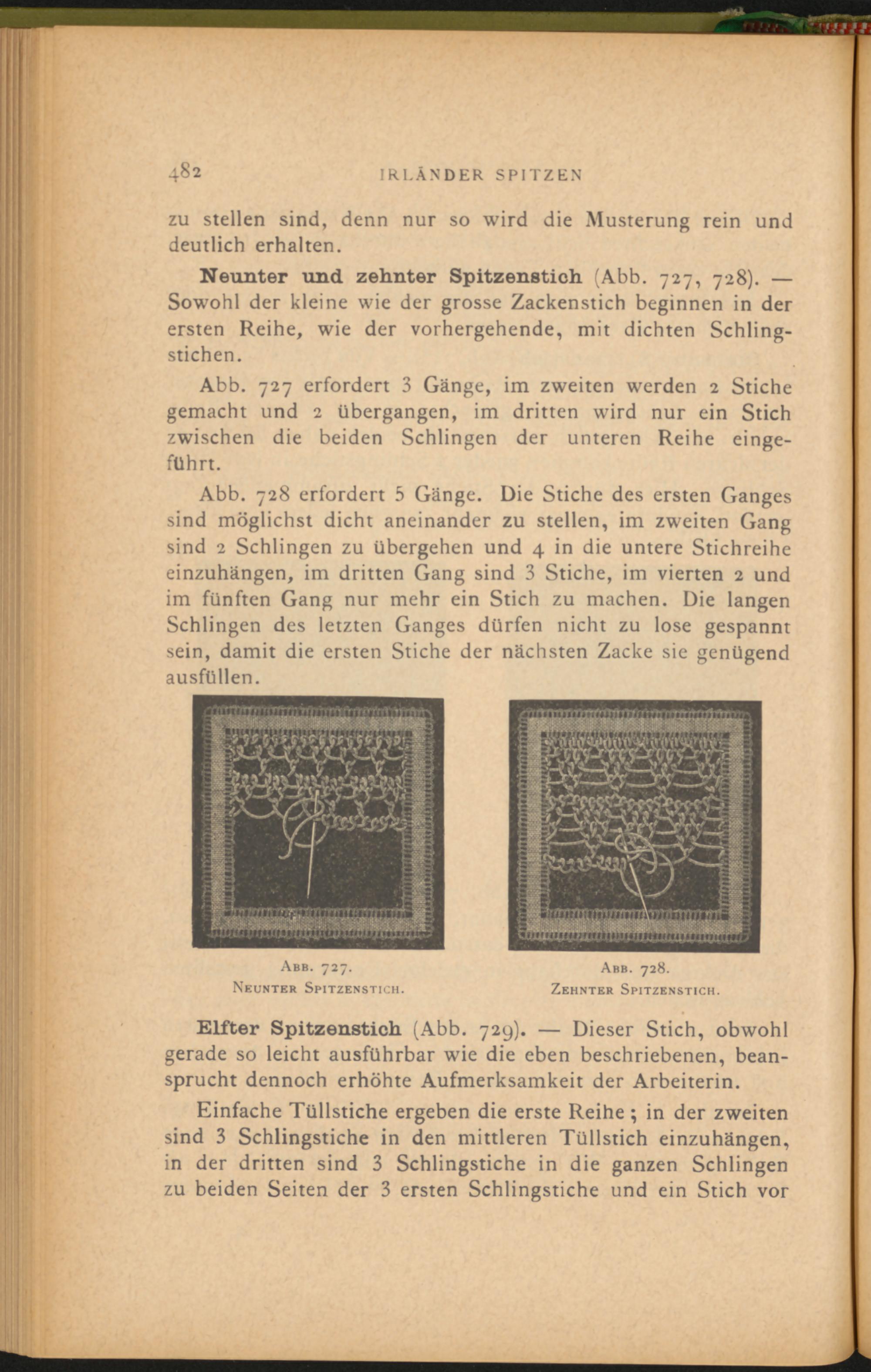 Neunter und. zehnter Spitzenstioh (Abb. 727, 728). — Sowohl der kleine wie der grosse Zackenstich beginnen in der ersten Reihe, wie der vorhergehende, mit dichten Schlingstichen.