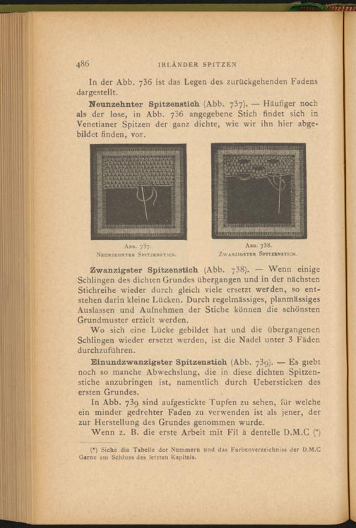 Zwanzigster Spitzenstich (Abb. 738 ). — Wenn einige Schlingen des dichten Grundes übergangen und in der nächsten Stichreihe wieder durch gleich viele ersetzt werden, so entstehen darin kleine Lücken. Durch regelmässiges, planmässiges Auslassen und Aufnehmen der Stiche können die schönsten Grundmuster erzielt werden.